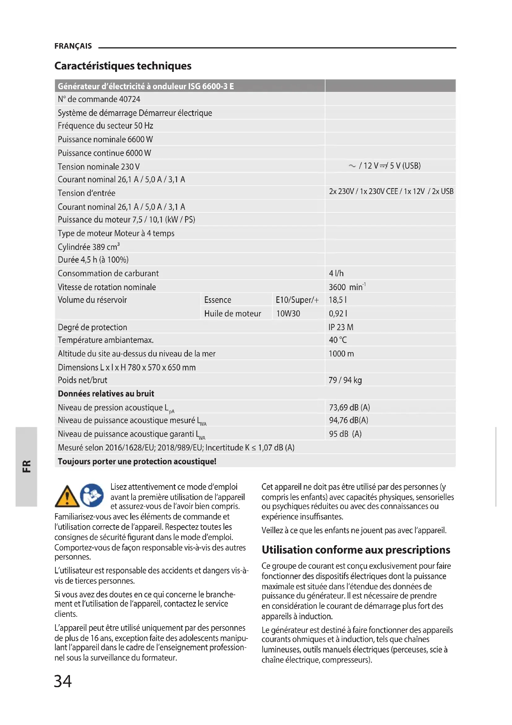 Caractéristiques techniques Générateur d’électricité à onduleur ISG 6600-3 E N° de commande 40724 Système de démarrage Démarreur électrique Fréquence du secteur 50 Hz Puissance nominale 6600 W Puissance continue 6000 W Tension nominale 230 V / 12 V / 5 V (USB) Courant nominal 26,1 A / 5,0 A / 3,1 A Tension d‘entrée 2x 230V / 1x 230V CEE / 1x 12V / 2x USB Courant nominal 26,1 A / 5,0 A / 3,1 A Puissance du moteur 7,5 / 10,1 (kW / PS) Type de moteur Moteur à 4 temps Cylindrée 389 cm³ Durée 4,5 h (à 100%) Consommation de carburant 4 l/h Vitesse de rotation nominale 3600 min