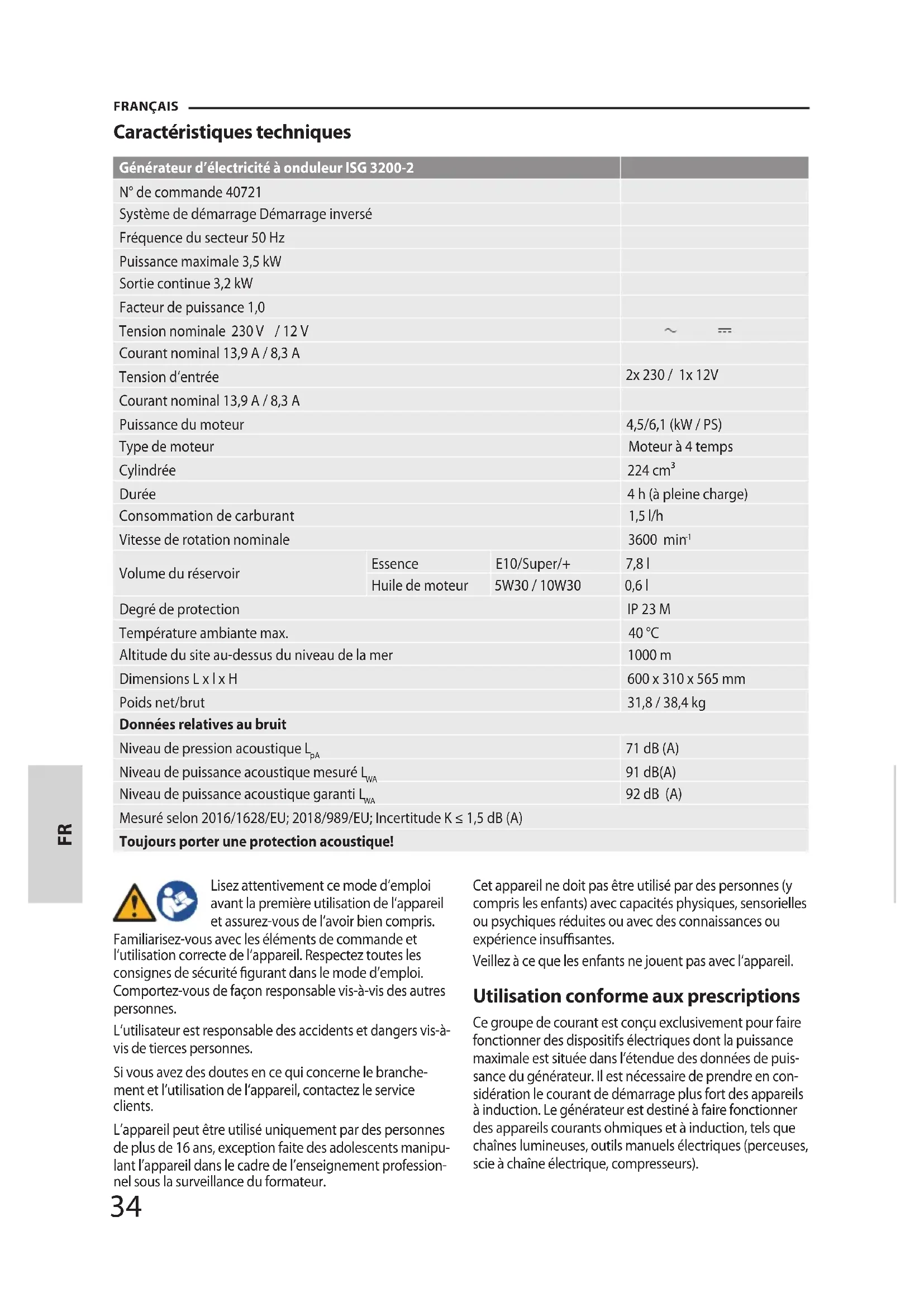 92 dB (A) Mesuré selon 2016/1628/EU; 2018/989/EU; Incertitude K ≤ 1,5 dB (A) Toujours porter une protection acoustique! Lisez attentivement ce mode d‘emploi avant la première utilisation de l‘appareil et assurez-vous de l‘avoir bien compris. Familiarisez-vous avec les éléments de commande et l‘utilisation correcte de l‘appareil. Respectez toutes les consignes de sécurité gurant dans le mode d’emploi. Comportez-vous de façon responsable vis-à-vis des autres personnes. L‘utilisateur est responsable des accidents et dangers vis-à- vis de tierces personnes. Si vous avez des doutes en ce qui concerne le branche- ment et l‘utilisation de l‘appareil, contactez le service clients. L’appareil peut être utilisé uniquement par despersonnes de plus de 16 ans, exception faite des adolescents manipu- lant l’appareil dans lecadre de l’enseignement profession- nel sous la surveillancedu formateur. Cet appareil ne doit pas être utilisé par des personnes (y compris les enfants) avec capacités physiques, sensorielles ou psychiques réduites ou avec des connaissances ou expérience insusantes. Veillez à ce que les enfants ne jouent pas avec l‘appareil. Utilisation conforme aux prescriptions Ce groupe de courant est conçu exclusivement pour faire fonctionner des dispositifs électriques dont la puissance maximale est située dans l‘étendue des données de puis- sance du générateur. Il est nécessaire de prendre en con- sidération le courant de démarrage plus fort des appareils à induction. Le générateur est destiné à faire fonctionner des appareils courants ohmiques et à induction, tels que chaînes lumineuses, outils manuels électriques (perceuses, scie à chaîne électrique, compresseurs). FRANÇAIS FR34 35