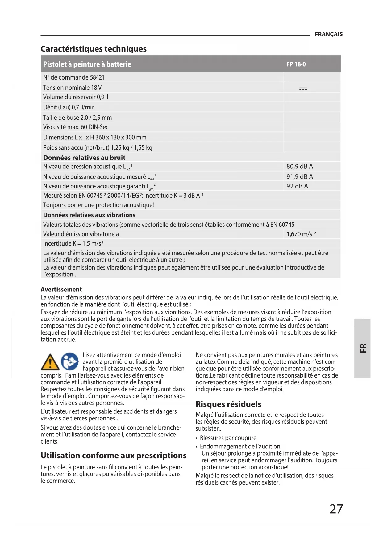 gers. Le non-respect du mode d’emploi et du mode de montage ainsi que l’usure normale ne sont pas non plus inclus dans la garantie. Informations importantes pour le client. Nous vous informons que l‘appareil doit être re- tourné pendant la durée de la garantie ou après la garantie dans son emballage d‘origine. Cette mesure permet d‘éviter ecacement tout dommage inutile lors du transport. L‘appareil est protégé de façon optimale seulement dans l‘emballage d‘origine et son traitement continu est ainsi assuré. Maintenance et entretien Vous avez des questions techniques ? Une réclamation ? Vous avez besoin de pièces détachées ou d’un mode d’emploi ? Nous vous aiderons rapidement et sans pa- perasserie inutile par l’intermédiaire de nos pages Web www.guede.com dans la rubrique Service. Aidez-nous pour que nous puissions vous aider. Pour identier votre appareil en cas de réclamation, nous avons besoin du numéro de série, du numéro de produit et de l‘année de fabrication. Toutes ces informations se trouvent sur la plaque signalétique. Numéro de série: Numéro de commande : Année de fabrication: Tel.: +49 (0) 79 04 / 700-360 Fax: +49 (0) 79 04 / 700-51999 E-mail: support@ts.guede.com31 ITALIANO Dati tecnici Pistola a spruzzo di vernice a batteria FP 18-0 N°. Articolo 58421 Tensione nominale 18 V Volume serbatoio 0,9 l Velocità di usso (Acqua) 0,7 l/min Dimensioni dell’ugello 2,0 / 2,5 mm Viscosità max. 60 DIN-Sec Dimensioni L x P x H 360 x 130 x 300 mm Peso senza batteria (netto/lordo) 1,25 kg / 1,55 kg Dati di rumorosità Livello di rumorosità L