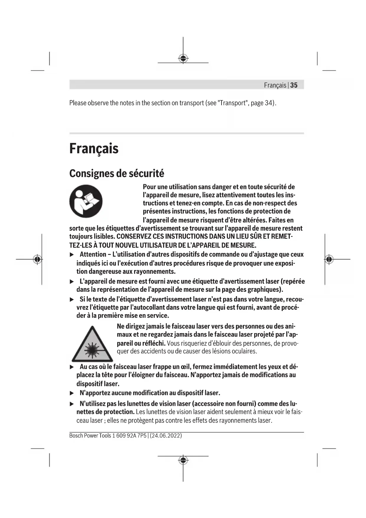 2609120713 (EU) 2609120718 (UK) 1600A013A0 (ARG) 1 609 92A 7P5 | (24.06.2022) Bosch Power ToolsFrançais | 41 Télémètre laser numé- rique GLM 50-22 GLM 50-23 G GLM 50-25 G 1600A013A1 (MEX) 1600A013A2 (BRL) A) Pour une mesure à partir du bord avant de l'appareil de mesure, valable en cas de cible à fort pou- voir réfléchissant (p. ex. mur peint en blanc), sous une faible luminosité ambiante et à une tempé- rature de fonctionnement de 25°C; en outre il faut s'attendre à un écart de ±0,05mm/m en fonc- tion de la distance. B) Pour une mesure à partir du bord avant de l'appareil, valable en cas de cible à fort pouvoir réflé- chissant (p. ex. mur peint en blanc), sous une luminosité ambiante forte, à une température de fonctionnement de 25°C et des altitudes élevées. Il convient en outre de prendre en compte un écart de ±0,15mm/m en fonction de la distance. C) En mode de mesure continu, la température de fonctionnement maxi s'élève à +40°C. D) N’est conçu que pour les salissures/saletés non conductrices mais supporte occasionnellement la conductivité due aux phénomènes de condensation. E) Vous trouverez d’autres caractéristiques techniques à l’adresse suivante : https://www.bosch-professional.com/ecodesign Le numéro de série (11) inscrit sur l'étiquette signalétique permet une identification précise de votre appareil de mesure. Mise en place/changement des piles Remplacez toujours toutes les piles en même temps. N’utilisez que des piles de la même marque avec la même capacité. Respectez ce faisant la polarité indiquée sur le graphique qui se trouve à l’intérieur du compartiment à piles. u Sortez les piles de l’appareil de mesure si vous savez que l’appareil ne va pas être utilisé pour une période prolongée. En cas de stockage prolongé, les piles peuvent se corroder et se décharger. Ne rangez jamais l'appareil de mesure sans le couvercle du compartiment à piles ou le bloc-batterie lithium-ion en place(13) ou le bloc-batterie lithium-ion(19) (ac- cessoires), surtout dans un environnement poussiéreux ou humide. Bosch Power Tools 1 609 92A 7P5 | (24.06.2022)42 | Français Bloc-batterie lithium-ion (accessoires) Mise en place/changement des accus Lithium-ion (accessoire) Insérez le bloc-batterie lithium-ion(19) (accessoires). Pour retirer le bloc-batterie lithium-ion(19) (accessoires), appuyez sur le verrouillage(20) et retirez le bloc-batterie lithium-ion. (voir Fig. A, Page5) Charger le bloc-batterie lithium-ion (accessoires) u Pour la charge, utilisez un adaptateur secteur USB dont les caractéristiques techniques (tension et courant de charge) correspondent à celles de l’adaptateur secteur recom- mandé. Pour ce faire, respectez la notice d’utilisation de l’adaptateur secteur USB. Adaptateur secteur recommandé: voir caractéristiques techniques. u Tenez compte de la tension du réseau! La tension du secteur doit correspondre aux indications se trouvant sur la plaque signalétique du chargeur secteur. Les chargeurs secteur marqués 230V peuvent également fonctionner sur 220V. Les batteries lithium-ion sont expédiées partiellement chargées en raison des ré- glementations internationales en matière de transport. Pour obtenir les perfor- mances maximales, chargez la batterie complètement avant la première utilisation. Pour plus d’informations, consultez la notice d’utilisation en ligne: www.bosch-pt.com/manuals Utilisation Mise en marche u Ne laissez pas l’appareil de mesure sans surveillance quand il est allumé et étei- gnez-le après l’utilisation. D’autres personnes pourraient être éblouies par le faisceau laser. u Protégez l’appareil de mesure contre l’humidité, ne l’exposez pas directement aux rayons du soleil. u N’exposez pas l’appareil de mesure à des températures extrêmes ou de brusques variations de température. Ne le laissez p. ex. pas trop longtemps dans une voiture exposée au soleil. Après un brusque changement de température, attendez que l’appa- reil de mesure prenne la température ambiante avant de l’utiliser. Des températures 1 609 92A 7P5 | (24.06.2022) Bosch Power ToolsFrançais | 43 extrêmes ou de brusques changements de température peuvent réduire la précision de l’appareil de mesure. u Évitez les chocs violents et évitez de faire tomber l’appareil de mesure. Lorsque l’appareil de mesure a été soumis à de fortes sollicitations extérieures, effectuez tou- jours un contrôle de précision (voir «Contrôle de précision», Page46) avant de continuer à l’utiliser Mise en marche/arrêt Pour mettre en marche l’appareil de mesure et activer en même temps le laser, ap- puyez sur la touche . Pour mettre en marche l'appareil de mesure sans activer le laser, appuyez sur la touche . Pour éteindre l’appareil de mesure, appuyez longuement sur la touche . Les valeurs en mémoire et les réglages de l'appareil sont conservés. Processus de mesure Après sa première mise en marche, l’appareil de mesure se trouve dans le mode Mesure de distances. À chaque fois que l’on met l’appareil de mesure en marche, celui-ci se trouve dans la dernière fonction de mesure utilisée. Trois réglages sont disponibles pour le plan de référence de la mesure. (voir «Sélection du plan de référence», Page44) Placez l’appareil de mesure au point de départ souhaité de la mesure (par ex. contre un mur). Si vous avez mis en marche l’appareil de mesure avec la touche , appuyez briève- ment sur la touche pour activer le laser. Appuyez sur la touche pour démarrer la mesure. Après le processus de mesure, le faisceau laser est éteint. Pour effectuer une autre me- sure, procédez de la même façon. Il est possible d’ajouter ou de soustraire des valeurs ou des résultats de mesure. Pour plus d’informations, consultez la notice d’utilisation en ligne: www.bosch-pt.com/manuals Bosch Power Tools 1 609 92A 7P5 | (24.06.2022)44 | Français L’ap