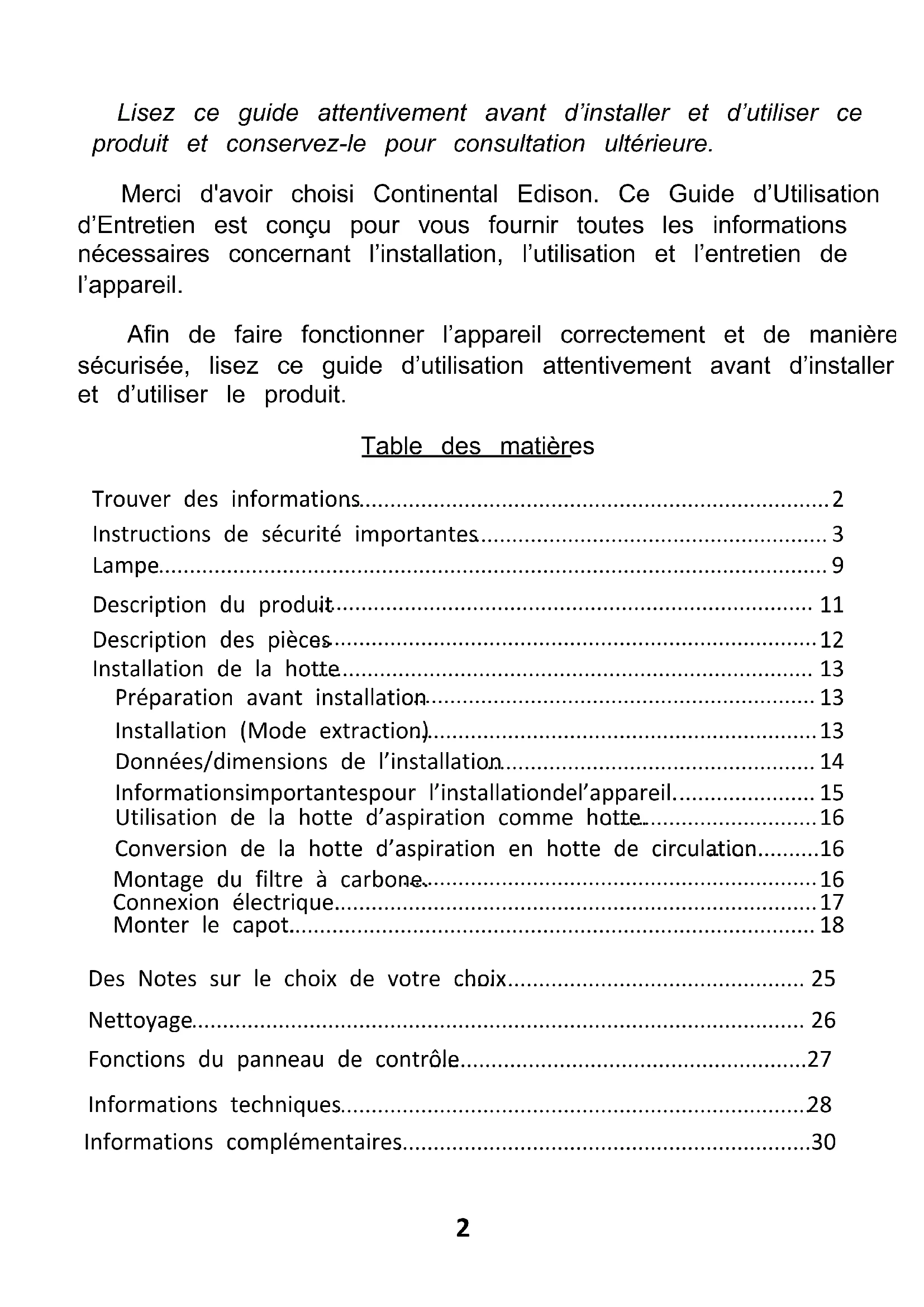 Hotte Plan De Travail En Verre - Downdraft Range Hood Guide d’utilisation - User manual2 Lisez ce guide attentivement avant d’installer et d’utiliser ce produit et conservez-le pour consultation ultérieure. Merci d'avoir choisi Continental Edison. Ce Guide d’Utilisation et d’Entretien est conçu pour vous fournir toutes les informations nécessaires concernant l’installation, l’utilisation et l’entretien de l’appareil. Afin de faire fonctionner l’appareil correctement et de manière sécurisée, lisez ce guide d’utilisation attentivement avant d’installer et d’utiliser le produit. Table des matières Trouver des informations