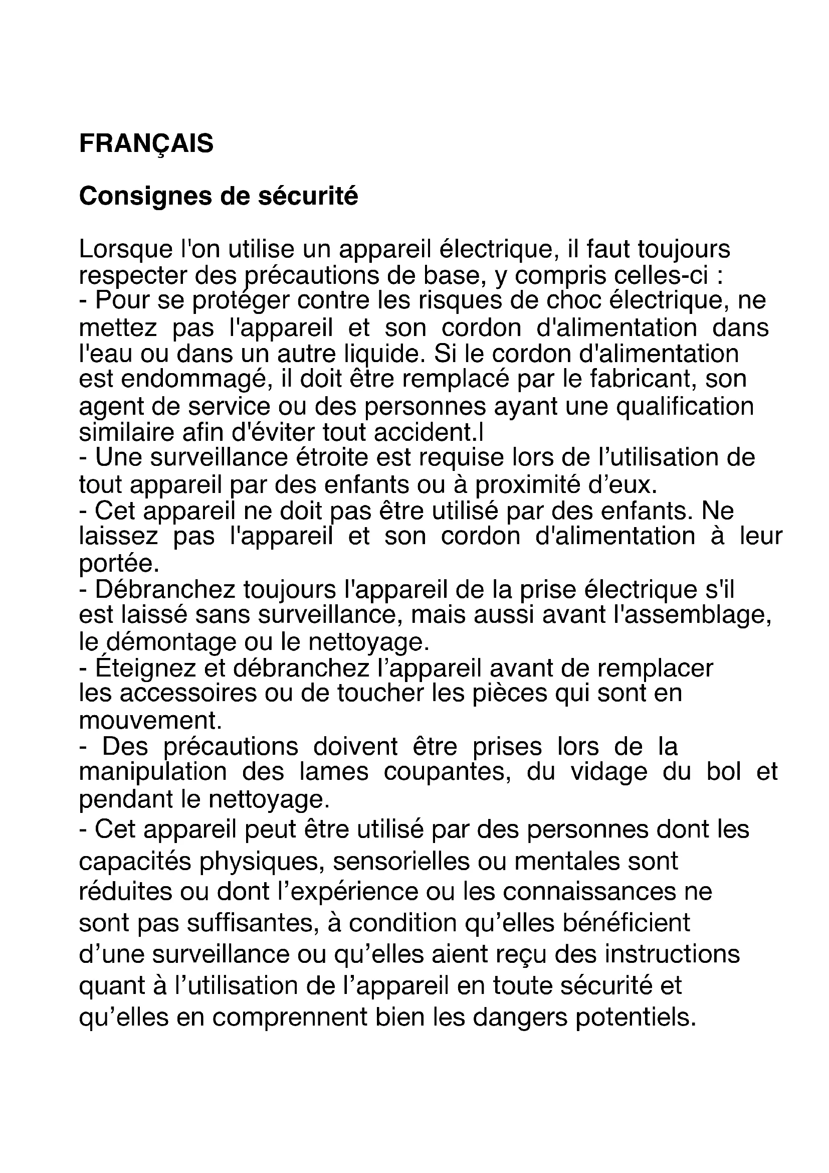 ENVIRONMENT CAUTION: Do not dispose of this product as it has with other household products. There is a separation of this waste product into communities, you will need to inform your local authorities about the places where you can return this product. In fact, electrical and electronic products contain hazardous substances that have harmful effects on the environment or human health and should be recycled. The symbol here indicates that electrical and electronic equipment should be chosen carefully, a wheeled waste container is marked with a cross. Adeva SAS / H.Koenig Europe - 8 rue Marc Seguin, 77290 Mitry-Mory, France www.hkoenig.com - https://en.hkoenig.com - Tél: +33 1 64 67 00 05FRANÇAIS Consignes de sécurité Lorsque l'on utilise un appareil électrique, il faut toujours respecter des précautions de base, y compris celles-ci : - Pour se protéger contre les risques de choc électrique, ne mettez pas l'appareil et son cordon d'alimentation dans l'eau ou dans un autre liquide. Si le cordon d'alimentation est endommagé, il doit être remplacé par le fabricant, son agent de service ou des personnes ayant une qualification similaire afin d'éviter tout accident.| - Une surveillance étroite est requise lors de l’utilisation de tout appareil par des enfants ou à proximité d’eux. - Cet appareil ne doit pas être utilisé par des enfants. Ne laissez pas l'appareil et son cordon d'alimentation à leur portée. - Débranchez toujours l'appareil de la prise électrique s'il est laissé sans surveillance, mais aussi avant l'assemblage, le démontage ou le nettoyage. - Éteignez et débranchez l’appareil avant de remplacer les accessoires ou de toucher les pièces qui sont en mouvement. - Des précautions doivent être prises lors de la manipulation des lames coupantes, du vidage du bol et pendant le nettoyage. - Cet appareil peut être utilisé par des personnes dont les capacités physiques, sensorielles ou mentales sont réduites ou dont l’expérience ou les connaissances ne sont pas suffisantes, à condition qu’elles bénéficient d’une surveillance ou qu’elles aient reçu des instructions quant à l’utilisation de l’appareil en toute sécurité et qu’elles en comprennent bien les dangers potentiels.- Débranchez l'appareil de la prise lorsque celui-ci n'est pas utilisé, avant de mettre ou d'enlever des pièces mobiles et avant de le nettoyer. - Évitez tout contact avec les pièces mobiles. Gardez vos mains, vos cheveux, vos vêtements, ainsi que les spatules et autres ustensiles à l'écart des fouets pendant le fonctionnement, afin de réduire les risques de blessure et / ou de détérioration du mixeur. - N’utilisez pas l’appareil si le cordon d'alimentation ou la prise est endommagée, ni après un dysfonctionnement, une chute ou un quelconque dégât à l’appareil. Renvoyez l’appareil au centre de service agréé le plus proche afin qu’il fasse l’objet d’un contrôle, d’une réparation, voire d’un réglage électrique ou mécanique. - L'utilisation d'accessoires, qui ne sont pas recommandés ou vendus par le fabricant de cet appareil, pourrait provoquer un incendie, une électrocution ou une blessure. - N’utilisez pas l'appareil à l'extérieur. Ce produit est uniquement conçu pour un usage domestique. - Ne laissez pas le câble pendre sur le bord d'une table ou d'un comptoir. - Enlevez les fouets du mixeur avant de les laver. - Cet appareil peut être utilisé par des enfants d’au moins 8 ans, tant qu’ils sont surveillés et ont reçu des instructions pour utiliser l’appareil en toute sécurité et sont pleinement conscients des dangers encourus. - Le nettoyage et l’entretien ne doivent pas être effectués par des enfants à moins qu’ils aient au moins 8 ans et qu’ils soient surveillés par un adulte. - Gardez l’appareil et son cordon d’alimentation hors de portée des enfants de moins de 8 ans. - Lors de l’utilisation d’équipements électriques, des précautions de sécurité doivent toujours être prises pouréviter les risques d’incendie, d’électrocution et / ou de blessure en cas de mauvaise utilisation. - Assurez-vous que la tension nominale sur la plaque signalétique corresponde à la tension principale de votre installation. Si ce n’est pas le cas, contactez le revendeur et ne branchez pas l’appareil. - Conservez ce manuel en lieu sûr et transmettez-le avec l’appareil au futur utilisateur. - L’emploi de l’appareil est uniquement domestique et en intérieur. - Votre appareil a été conçu pour un usage domestique seulement. Elle n’a pas été conçue pour être utilisée dans les cas suivants qui ne sont pas couverts par la garantie : – dans des coins de cuisines réservés au personnel dans des magasins, bureaux et autres environnements professionnels, – dans des fermes auberges, – par les clients des hôtels, motels et autres environnements à caractère résidentiel, – dans des environnements de type chambres d’hôtes.