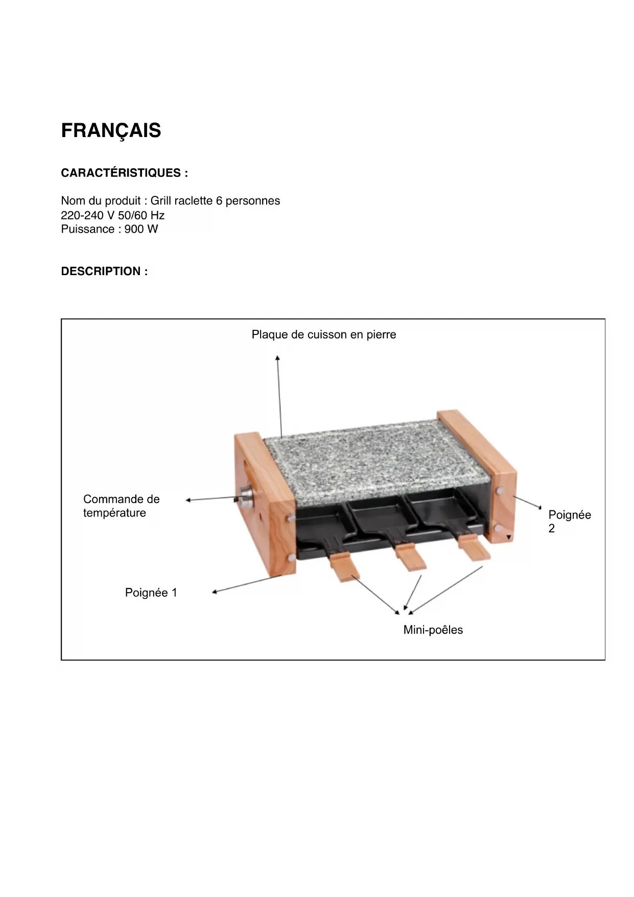 § Avant de brancher votre nouveau grill raclette, vérifiez que le circuit électrique ne soit pas surchargé avec d'autres appareils. Cet appareil doit toujours être utilisé sur une prise secteur séparée de 220-240 volts, capable de fournir au minimum 16A. § Assurez-vous que votre appareil repose sur le comptoir. Évitez d'utiliser des mini-poêles qui soient instables et qui puissent facilement tomber. Placez les mini-poêles sous l'élément chauffant. § Mettez le thermostat en position 1. Le témoin s'allume pour indiquer que l'élément chauffant est sous tension et que le chauffage commence immédiatement § Les surfaces métalliques vont devenir chaudes. Ne les touchez pas pendant l'utilisation. Lorsque la cuisson est terminée, ramenez le thermostat à la Position O. § La surface est chaude lors de l'utilisation ou avant le refroidissement. Ne touchez jamais l'appareil avant qu'il n’ait refroidi pour éviter les brûlures. § Si la plaque de cuisson ne va pas être utilisée pendant une longue période, il est recommandé de débrancher l'appareil de la prise de courant. Cela permet d’éviter des accidents.