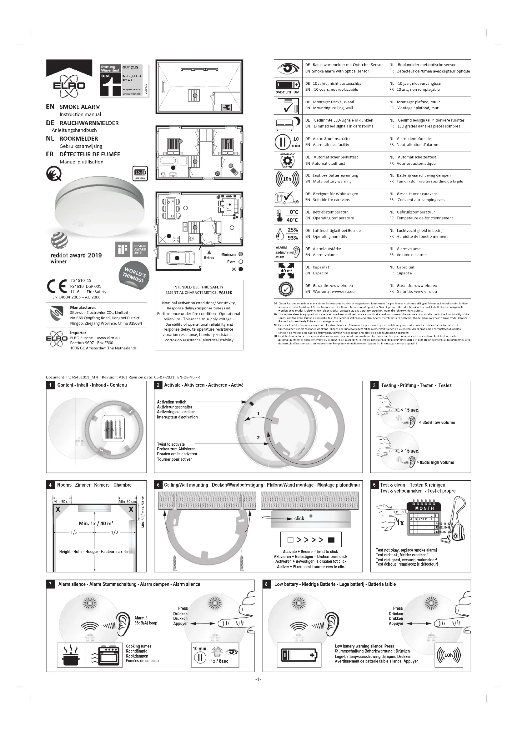 - Raadpleeg de lokale voorschrien. Probleemoplossing: Vals alarm wordt vaak veroorzaakt door stof of stoom. Bij twijfel: Verlaat het pand en onderneem ace! Aanvullende installaeinstruces: Gangen met max. breedte 3m: Max. 15m tussen 2 melders. Max 7,5m afstand tot voorzijde en melders in hoeken en kruisingen van gangen. Galerijen: Lengte en breedte >2m en >16m²: Extra melder onder galerij. Gedeeltelijke dakhelling: Vlak plafond ≤1m breed, beschouw als hellend dak. Vlak plafond >1m breed, beschouw als vlak plafond. FR - Symbols: Recyclage et mise au rebut: Le symbole WEEE signifie que ce produit et baeries ne doivent pas être jeté avec les ordures. Une fois le produit arrivée en fin de vie, déposez-la au centre de tri le plus proche de chez vous, où elle sera mise au rebut ou recyclée en toute sécurité. Protéger l'environnement, la santé des personnes et des ressources naturelles! Veuillez lire aenvement le manuel avant ulisaon et le conserver à un endroit sûr. Déclaraon de Performance (DoP) aller à www.elro.eu. Averssements: