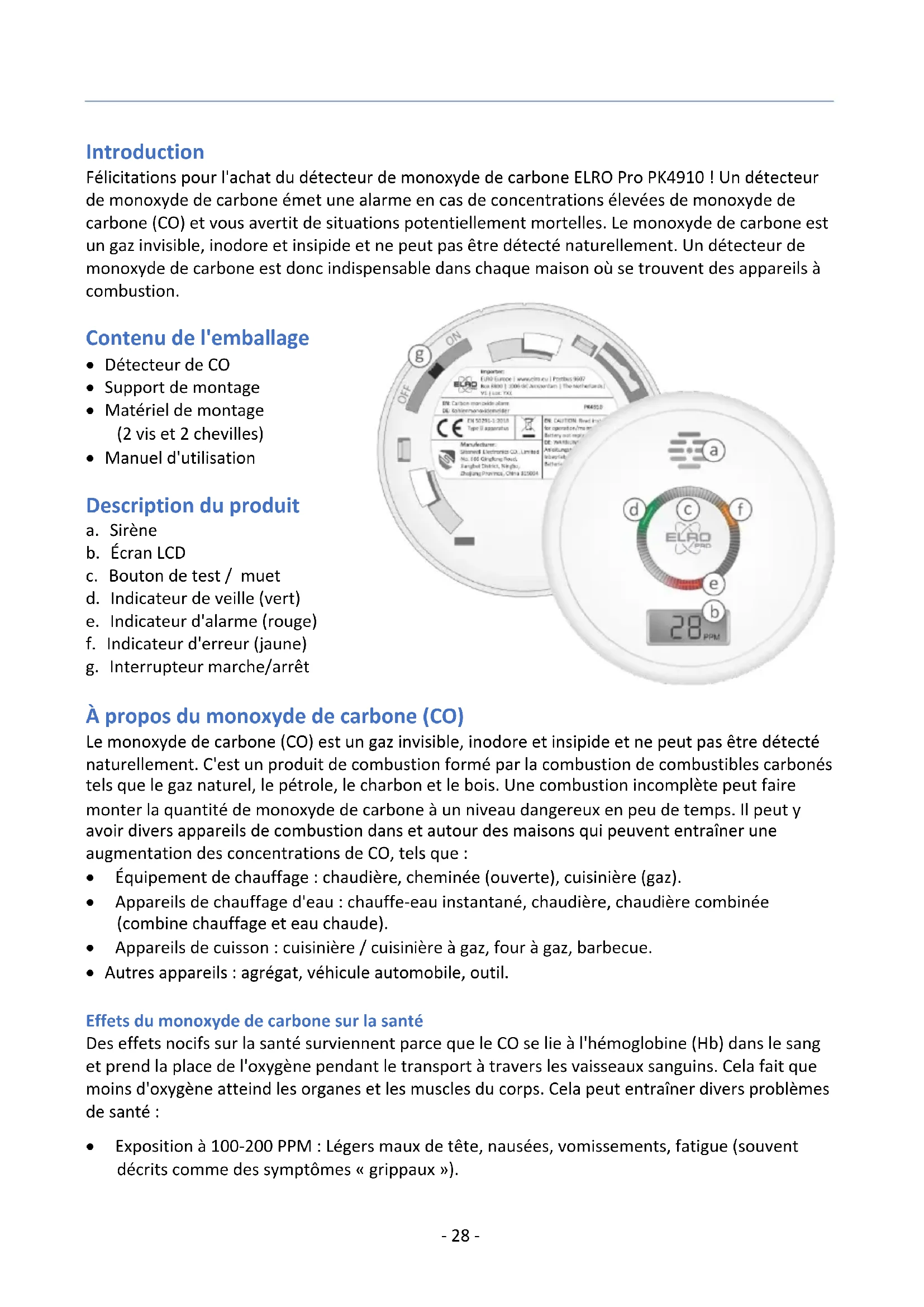 - Manuel d'utilisation Description du produit a. Sirène b. Écran LCD c. Bouton de test / muet d. Indicateur de veille (vert) e. Indicateur d'alarme (rouge) f. Indicateur d'erreur (jaune) g. Interrupteur marche/arrêt À propos du monoxyde de carbone (CO) Le monoxyde de carbone (CO) est un gaz invisible, inodore et insipide et ne peut pas être détecté naturellement. C'est un produit de combustion formé par la combustion de combustibles carbonés tels que le gaz naturel, le pétrole, le charbon et le bois. Une combustion incomplète peut faire monter la quantité de monoxyde de carbone à un niveau dangereux en peu de temps. Il peut y avoir divers appareils de combustion dans et autour des maisons qui peuvent entraîner une augmentation des concentrations de CO, tels que :