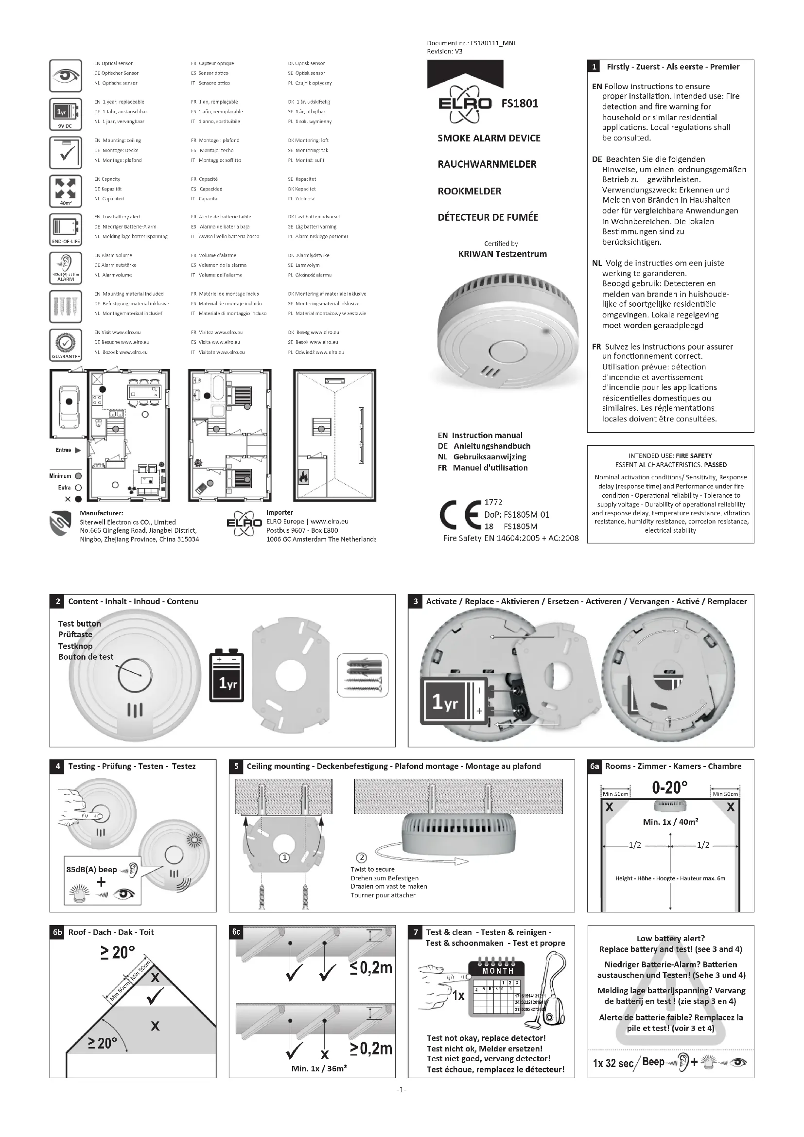 - Raadpleeg de lokale voorschrien. Probleemoplossing: Vals alarm wordt vaak veroorzaakt door stof of stoom. Bij twijfel: Verlaat het pand en onderneem ace! Aanvullende installaeinstruces: Gangen met max. breedte 3m: Max. 15m tussen 2 melders. Max 7,5m afstand tot voorzijde en melders in hoeken en kruisingen van gangen. Galerijen: Lengte en breedte >2m en >16m²: Extra melder onder galerij. Gedeeltelijke dakhelling: Vlak plafond ≤1m breed, beschouw als hellend dak. Vlak plafond >1m breed, beschouw als vlak plafond. FR - Symbols: Recyclage et mise au rebut: Le symbole WEEE signifie que ce produit et baeries ne doivent pas être jeté avec les ordures. Une fois le produit arrivée en fin de vie, déposez-la au centre de tri le plus proche de chez vous, où elle sera mise au rebut ou recyclée en toute sécurité. Protéger l'environnement, la santé des personnes et des ressources naturelles! Veuillez lire aenvement le manuel avant ulisaon et le conserver à un endroit sûr. Déclaraon de Performance (DoP) aller à www.elro.eu. Averssements:
