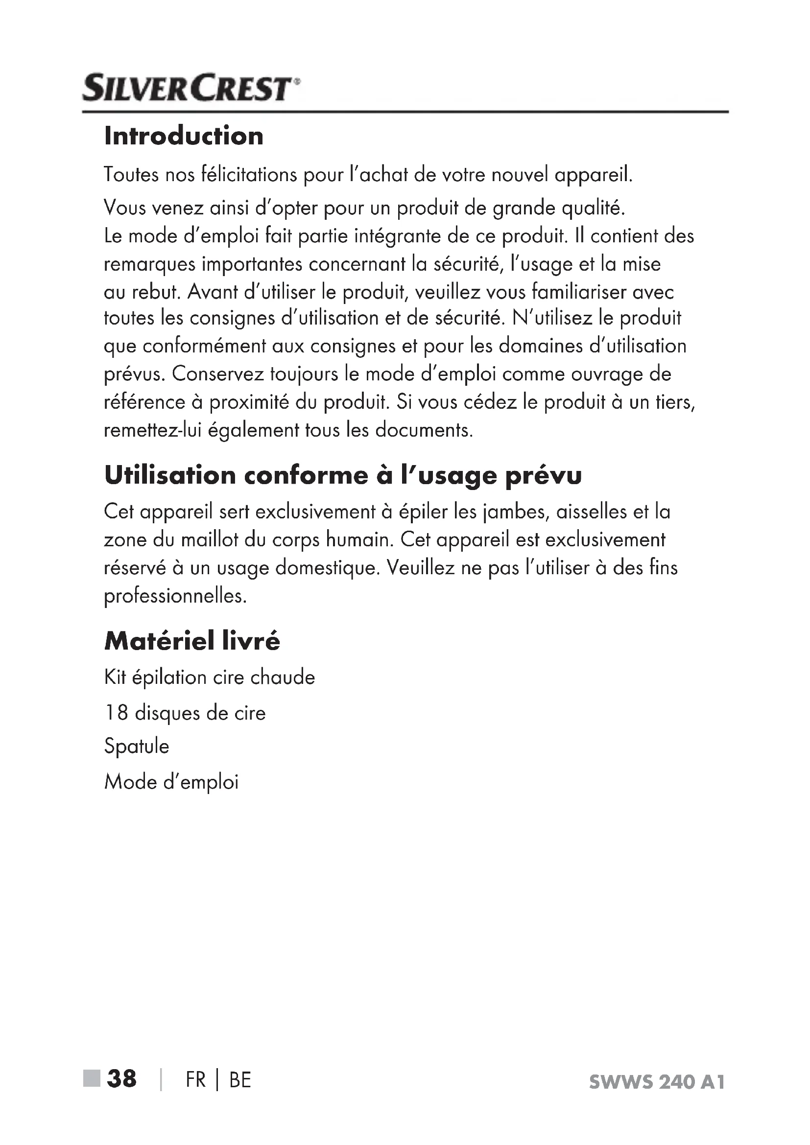 SWWS 240 A1 Introduction Toutes nos félicitations pour l’achat de votre nouvel appareil. Vous venez ainsi d’opter pour un produit de grande qualité. Le mode d’emploi fait partie intégrante de ce produit. Il contient des remarques importantes concernant la sécurité, l’usage et la mise au rebut. Avant d’utiliser le produit, veuillez vous familiariser avec toutes les consignes d’utilisation et de sécurité. N’utilisez le produit que conformément aux consignes et pour les domaines d’utilisation prévus. Conservez toujours le mode d’emploi comme ouvrage de référence à proximité du produit. Si vous cédez le produit à un tiers, remettez-lui également tous les documents. Utilisation conforme à l’usage prévu Cet appareil sert exclusivement à épiler les jambes, aisselles et la zone du maillot du corps humain. Cet appareil est exclusivement réservé à un usage domestique. Veuillez ne pas l’utiliser à des fins professionnelles. Matériel livré Kit épilation cire chaude 18 disques de cire Spatule Mode d’emploiFR