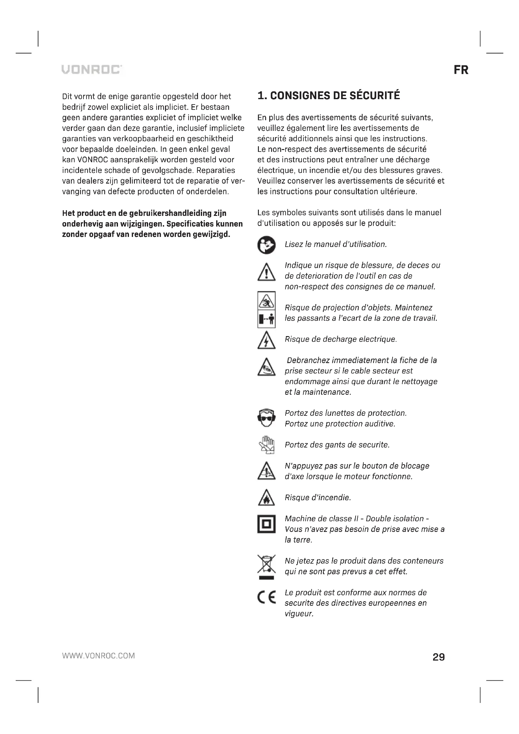 - Des pièces détachées non d’origine ont été utilisées. Ceci constitue l’unique garantie accordée par la société explicitement ou implicitement. Il n’existe aucune autre garantie, explicite ou implicite, qui peut s’étendre au delà du contenu ici présent, y compris les garanties marchandes ou d’adaptation à des fins particulières. En aucun cas VONROC ne sera tenu responsable de dommages accidentels ou consécutifs. Les solutions proposées par les reven- deurs devront se limiter à la réparation ou le rempla- cement des éléments ou pièces non conformes. Le produit et le manuel d’utilisation sont sujets à modifications. Les spécifications peuvent changer sans préavis.38