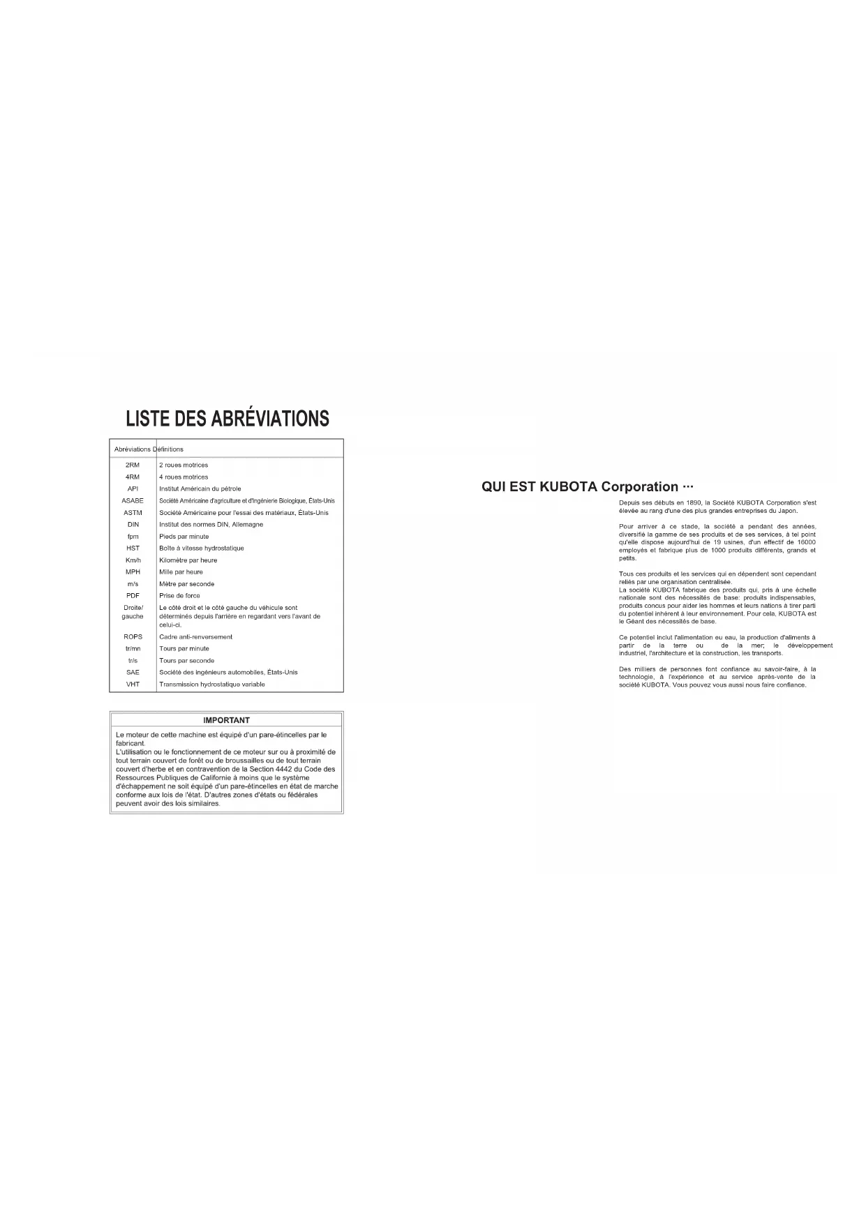 Vous êtes maintenant l'heureux propriétaire d'un véhicule KUBOTA. Ce véhicule est le produit de l'ingénierie et de la fabrication de haute qualité KUBOTA. Il est fabriqué avec les meilleurs matériaux et sous un système de contrôle de qualité très rigoureux. Il vous donnera un service long et satisfaisant. Pour tirer le meilleur parti de votre véhicule, lisez attentivement ce manuel. Il vous aidera à vous familiariser avec son fonctionnement et vous y trouverez de nombreux conseils sur l'entretien de ce véhicule. Ce manuel contient les instructions pour les entretiens mineurs, pour les informations concernant des entretiens majeurs, consultez le manuel d'atelier KUBOTA. Les procédures d'entretien majeures seulement être complétées par un technicien du concessionnaire KUBOTA. Chez KUBOTA, nous avons pour but d'appliquer aussitôt que possible tous les progrès réalisés grâce à notre recherche. La mise en œuvre immédiate de nouvelles techniques dans la fabrication de certains produits pourra faire que des petites sections de ce manuel soient périmées. Les distributeurs et concessionnaires KUBOTA disposeront cependant des informations les plus récentes.