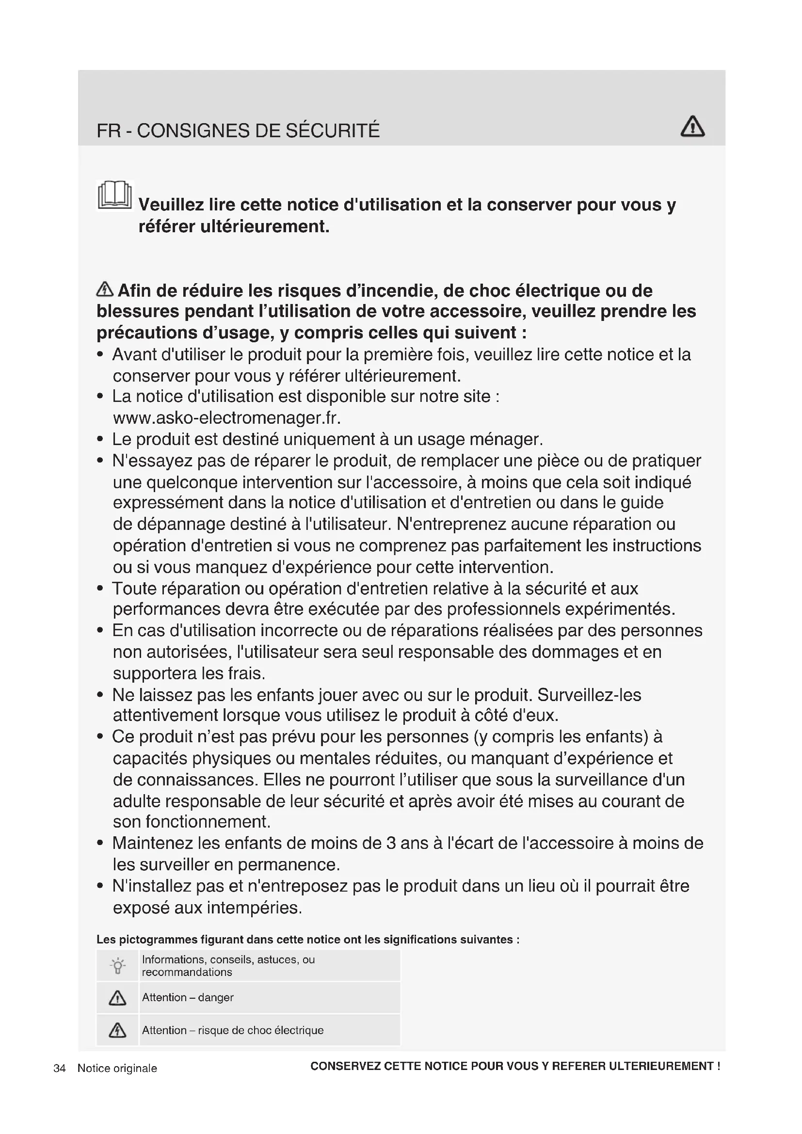 - N'installez pas et n'entreposez pas le produit dans un lieu où il pourrait être exposé aux intempéries. Notice originale CONSERVEZ CETTE NOTICE POUR VOUS Y REFERER ULTERIEUREMENT ! Les pictogrammes figurant dans cette notice ont les significations suivantes : Informations, conseils, astuces, ou recommandations Attention – danger Attention – risque de choc électrique35 L’accessoire de buanderie doit être utilisé exclusivement avec un lave-linge et un sèche-linge Asko Appliances.