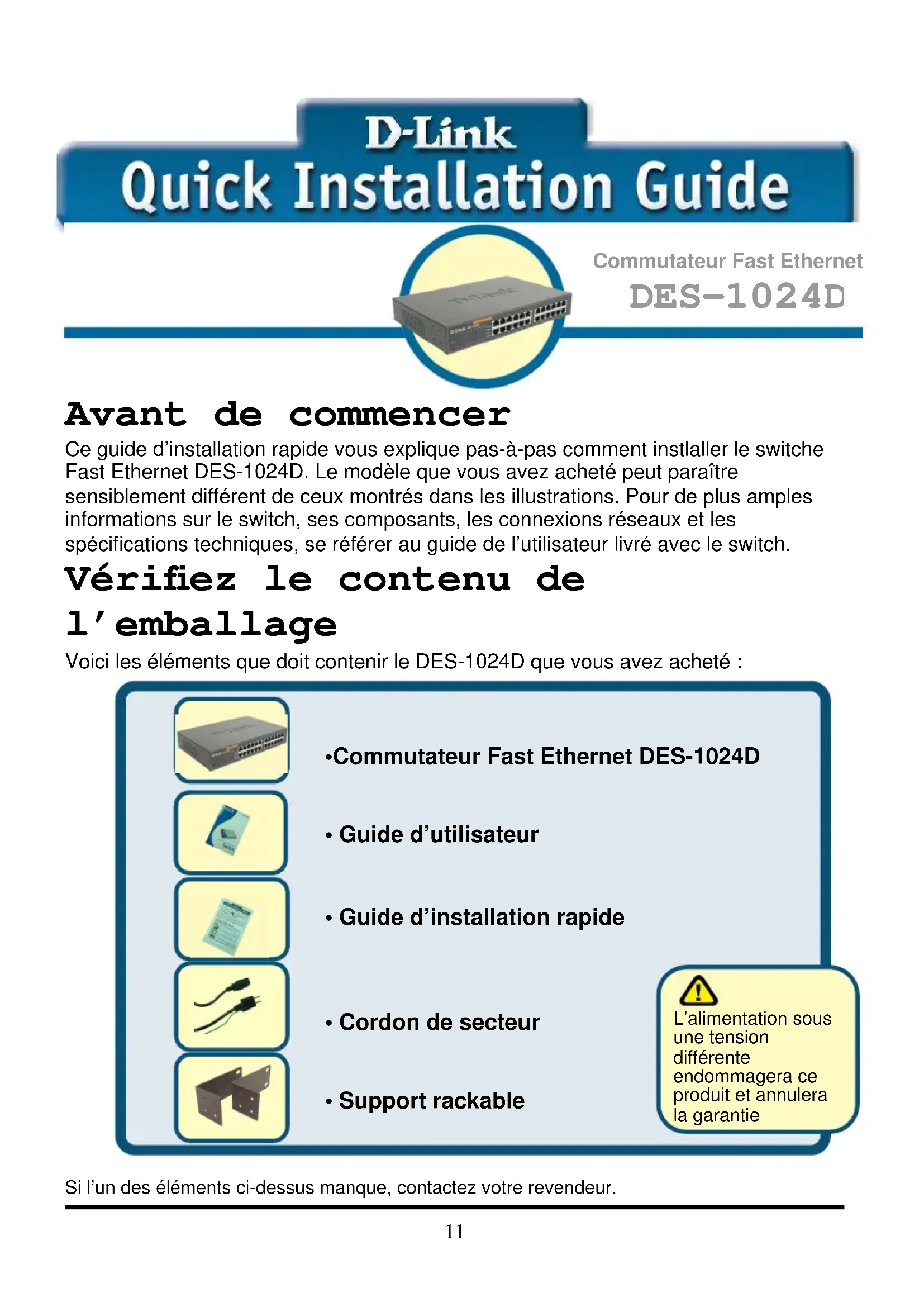 Avant de commencer Ce guide d’installation rapide vous explique pas-à-pas comment instlaller le switche Fast Ethernet DES-1024D. Le modèle que vous avez acheté peut paraître sensiblement différent de ceux montrés dans les illustrations. Pour de plus amples informations sur le switch, ses composants, les connexions réseaux et les spécifications techniques, se référer au guide de l’utilisateur livré avec le switch. Vérifiez le contenu de l’emballage Voici les éléments que doit contenir le DES-1024D que vous avez acheté :