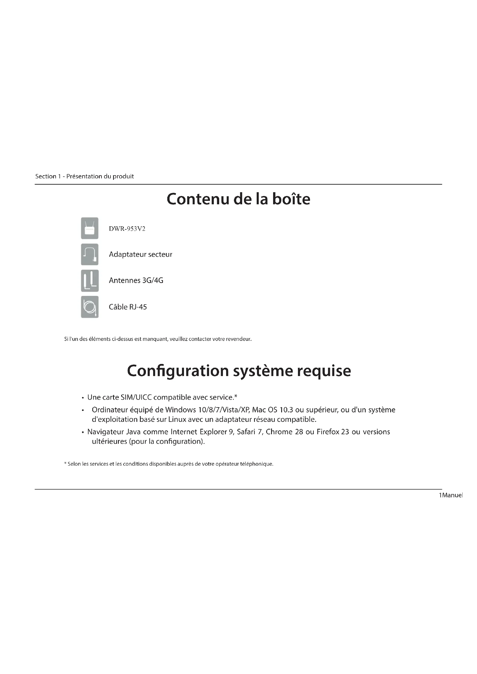 - Navigateur Java comme Internet Explorer9, Safari 7, Chrome 28 ou Firefox23 ou versions ultérieures (pour la conguration). Adaptateur secteur Antennes 3G/4G Câble RJ-45 DWR-953V22Manuel d’utilisation de la DWR-953V2 D-Link
