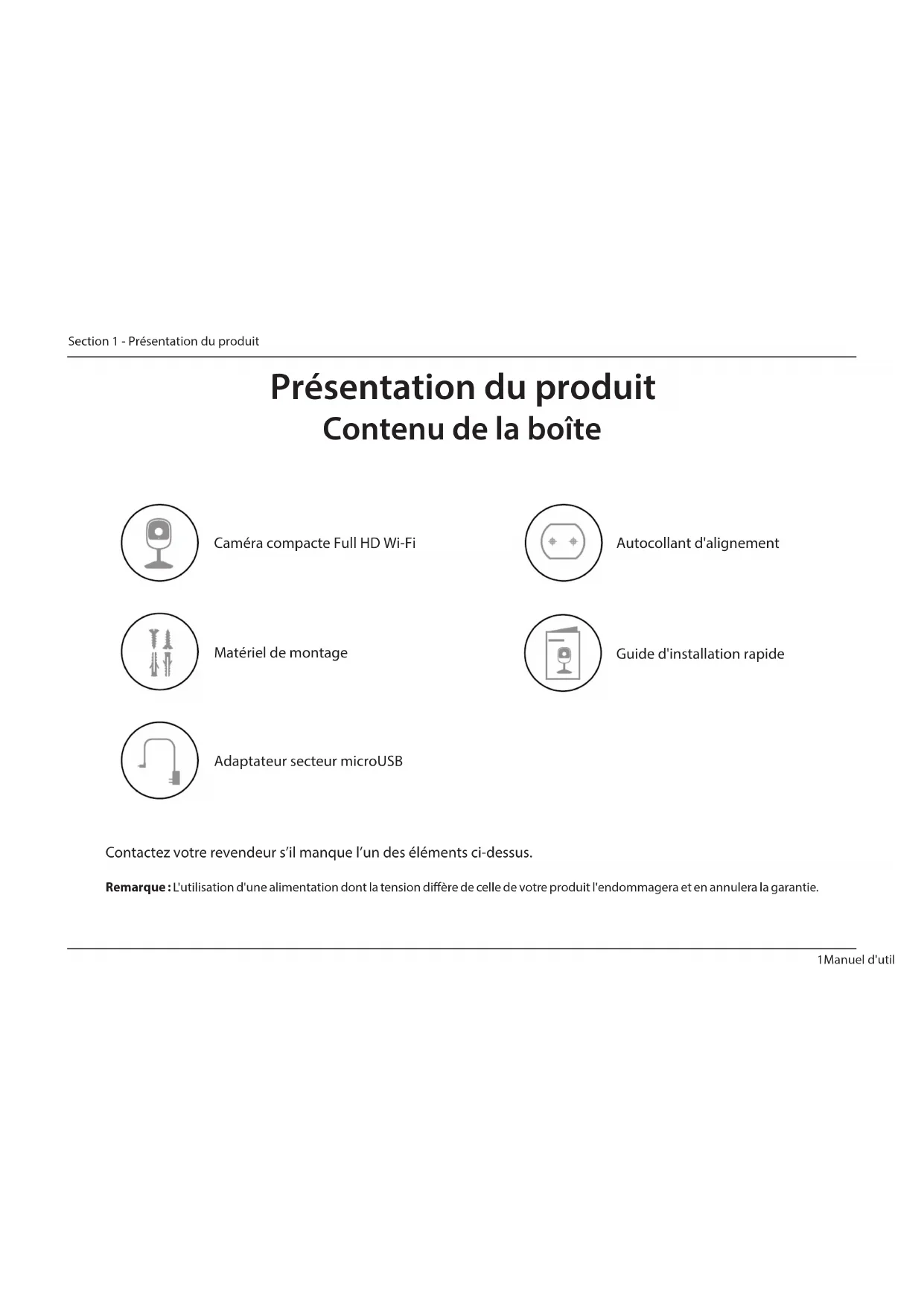 Présentation du produit Contenu de la boîte Contactez votre revendeur s’il manque l’un des éléments ci-dessus. Remarque: L'utilisation d'une alimentation dont la tension dière de celle de votre produit l'endommagera et en annulera la garantie. Caméra compacte Full HD Wi-Fi Matériel de montage Guide d'installation rapide Autocollant d'alignement Adaptateur secteur microUSB2Manuel d'utilisation de la DCS-6100LH D-Link