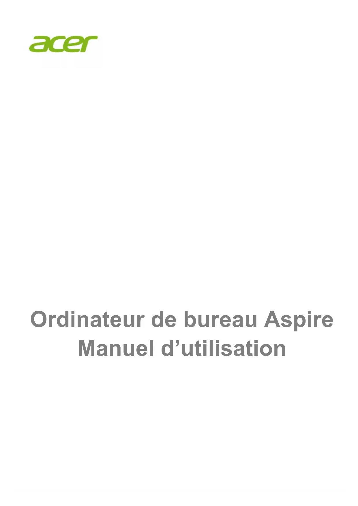 - Des informations sur l’utilisation des logiciels fournis par AcerPour commencer - 5 POUR COMMENCER Nous désirons vous remercier d’avoir fait de cet Acer ordinateur de bureau votre choix pour répondre à vos besoins informatiques. Vos guides Pour vous aider à utiliser votre Acer ordinateur de bureau, nous avons conçu plusieurs guides : Tout d’abord, le Guide de configuration (ou Poster de configuration) vous aide à configurer votre ordinateur. Le Guide rapide présente les fonctionnalités et fonctions de base de votre ordinateur. Pour plus d’information sur l’aide que peut vous apporter votre ordinateur pour être plus productif, veuillez vous reporter au Manuel d’utilisation. Ce guide contient des informations détaillées sur des sujets tels que les utilitaires systèmes, la récupération des données, les options d’extension et le dépannage. Pour télécharger le Manuel d’utilisation, vous devez d'abord être connecté à Internet. Ouvrez Acer Care Center sur le Bureau et cliquez sur le lien sous [Support] (Soutien). Le lien ouvrera la page Web de Support Acer. Défilez en bas vers [Drivers and Manuals] (Pilotes et manuels) et recherchez votre modèle en entrant le numéro de série, SNID, ou modèle de produit. Vous pouvez également télécharger et installer l’outil d’identification Acer qui permet de détecter automatiquement ces informations et vous permet de le copier dans le presse-papiers. Une fois trouvé votre modèle de produit, sélectionnez [Documents] (Documents) et sélectionnez votre langue pour télécharger Manuel d’utilisation.6 - Pour commencer Conseils élémentaires de soin et d’utilisation de votre ordinateur Éteindre votre ordinateur L’ordinateur peut être éteint de plusieurs manières :