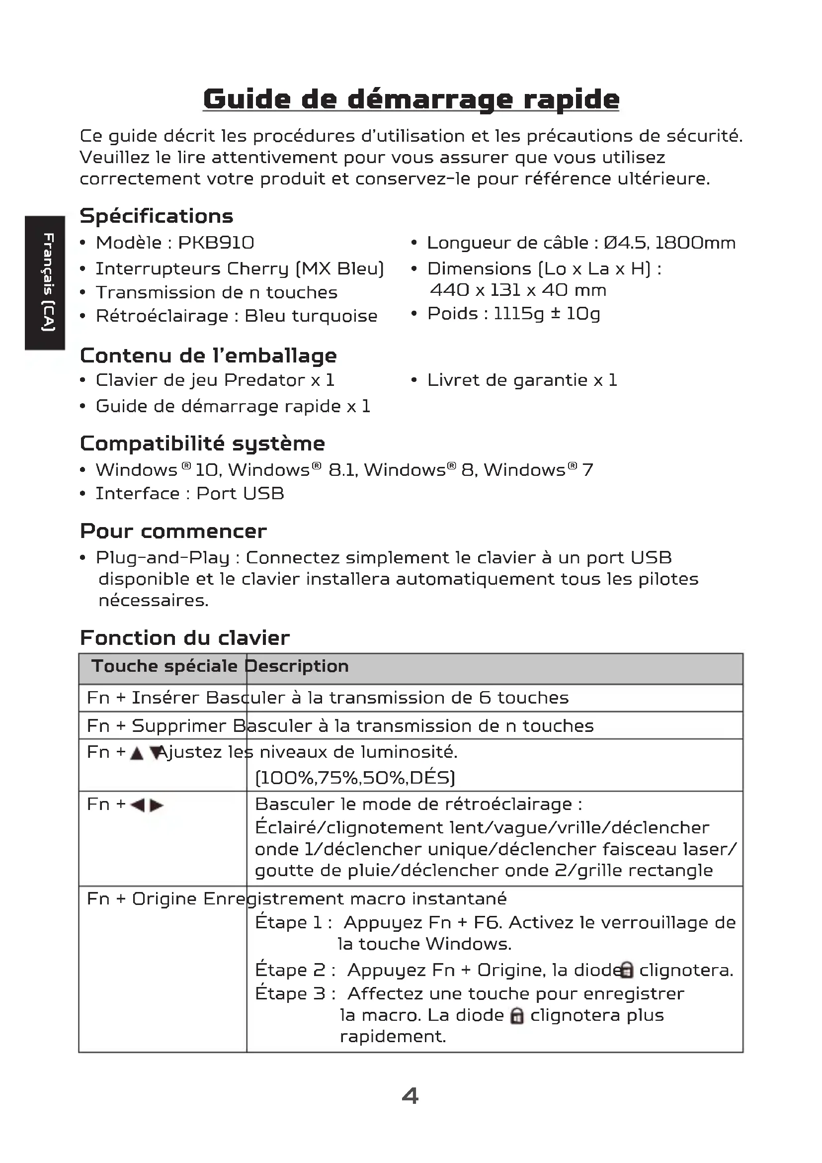 - Plug-and-Play : Connectez simplement le clavier à un port USB disponible et le clavier installera automatiquement tous les pilotes nécessaires. Fonction du clavier Touche spéciale Description Fn + Insérer Basculer à la transmission de 6 touches Fn + Supprimer Basculer à la transmission de n touches Fn + Ajustez les niveaux de luminosité. (100%,75%,50%,DÉS) Fn + Basculer le mode de rétroéclairage : Éclairé/clignotement lent/vague/vrille/déclencher onde 1/déclencher unique/déclencher faisceau laser/ goutte de pluie/déclencher onde 2/grille rectangle Fn + Origine Enregistrement macro instantané Étape 1 : Appuyez Fn + F6. Activez le verrouillage de la touche Windows. Étape 2 : Appuyez Fn + Origine, la diode clignotera. Étape 3 : Affectez une touche pour enregistrer la macro. La diode clignotera plus rapidement.5 Français (CA) Touche spéciale Description Étape 4 : Saisissez la touche qui est dans la liste des macros. Étape 5 : Appuyez Fn + Origine, terminez l’enregistrement macro instantané. Le processus d’enregistrement sera terminé si aucune action n’est effectuée dans les 20secondes. Règles de confort Certaines recherches suggèrent que de longues périodes de mouvement répétitif, dans un espace de travail inadéquat, avec une mauvaise position du corps et de mauvaises habitudes de travail peuvent être associées à une gêne physique et à des blessures aux nerfs, aux tendons et aux muscles. Voici quelques règles pour optimiser le confort d’utilisation et éviter les blessures.