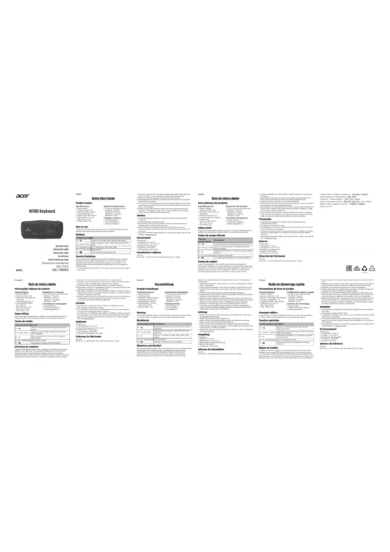 Ne démontez pas l’appareil et n’utilisez pas l’appareil dans des conditions anormales. Ne plongez pas l’appareil dans l’eau. Si l’appareil ne fonctionne pas ou s’il y a eu une situation anormale, veuillez rebrancher le connecteur. Si vous avez toujours des problèmes après avoir passé en revue les mesures correctrices, veuillez contacter votre revendeur ou un centre de service agréé. Pour plus d’informations concernant les accessoires Acer, veuillez visiter le site Web d’Acer sur www.acer.com Environnement Température : En marche : 0 °C à 40 °C À l’arrêt : -10 °C à 60 °CHumidité (sans condensation) : En marche : 10% à 90% À l’arrêt : 10% à 90% Adresse du fabricant Acer Inc.8F, 88, Sec. 1, Xintai 5th Rd. Xizhi, New Taipei City 221, TaiwanNITRO KEYBOARD Safety Flyer Europe – EU Declaration of Conformity The product is conformity with all the essential requirements and other provisions of the European Council Directive: RoHS Directive (2011/65/EU), EMC Directive (2014/30/EU) and the Low Voltage Directive (2014/35/EU). Europe – Déclaration de conformité UE Le produit est conforme à toutes les exigences essentielles et autres dispositions de la Directive du Conseil européen : Directive RoHS (2011/65/UE), Directive CEM RED (2014/30/UE) et Directive Basse Tension (2014/35/UE). Europa - EU-Konformitätserklärung Das Produkt entspricht allen wesentlichen Anforderungen und anderen Bestimmungen der Richtlinie des Europäischen Rates: RoHS-Richtlinie (2011/65/EU), RED EMV-Richtlinie (2014/30/EU) und der Niederspannungsrichtlinie (2014/35/EU).This product must not be disposed of with your other household waste or treat them in compliance with the local regulations or contact your local city oce, your household waste disposal service or the shop where you purchased the product.Ce produit ne doit pas être jeté avec vos autres ordures ménagères, traitez-le en conformité avec les réglementations locales ou contactez votre bureau municipal, votre service d'élimination des déchets ménagers ou le magasin où vous avez acheté le produit.Dieses Produkt darf nicht mit Ihrem Hausmüll entsorgt werden. Beachten Sie die lokalen Vorschriften für den Umgang oder wenden Sie sich an die zuständige lokale Behörde, Ihren Hausmüllbeseitigungsdienst oder das Geschäft, in dem Sie das Produkt gekauft haben.This device complies with Part 15 of the FCC Rules. Operation is subject to the following two conditions: (1) This device may not cause harmful interference, and (2) this device must accept any interference received, including interference that may cause undesired operation.This equipment has been tested and found to comply with the limits for a Class B digital device, pursuant to Part 15 of the FCC Rules. These limits are designed to provide reasonable protection against harmful interference in a residential installation. This equipment generates, uses and can radiate radio frequency energy and, if not installed and used in accordance with the instructions, may cause harmful interference to radio communications. However, there is no guarantee that interference will not occur in a particular installation. If this equipment does cause harmful interference to radio or television reception, which can be determined by turning the equipment o and on, the user is encouraged to try to correct the interference by one of the following measures:- Reorient or relocate the receiving antenna.- Increase the separation between the equipment and receiver.- Connect the equipment into an outlet on a circuit dierent from that to which the receiver is connected.- Consult the dealer or an experienced radio/TV technician for help.FCC Caution: Any changes or modications not expressly approved by the party responsible for compliance could void the user's authority to operate this equipment.This Class B digital apparatus complies with Canadian ICES-003.Cet appareil est conforme à l’article 15 des Réglementations de la FCC. Le fonctionnement est subordonné aux deux conditions suivantes : (1) Cet appareil ne doit pas provoquer d’interférences nuisibles, et (2) cet appareil doit accepter toute interférence reçue, y compris des interférences qui peuvent provoquer un fonctionnement non désiré.Cet équipement a été testé et reconnu conforme aux normes applicables au matériel informatique de Classe B, en vertu de l’article 15 des Réglementations de la FCC. Ces normes visent à fournir aux installations résidantes une protection raisonnable contre les interférences. Cet équipement génère, utilise et peut diuser des signaux radioélectriques.En outre, s’il n’est pas installé et employé conformément aux instructions, il peut provoquer des interférences nuisibles aux communications radio. Quoi qu’il en soit, on ne peut pas garantir que des interférences ne se produiront pas dans certaines installations. Si cet équipement est à l’origine de nuisances vis-à-vis de la réception de la radio ou de la télévision, ce que l’on peut déterminer en l’allumant puis en l’éteignant, Русский Руководство пользователя