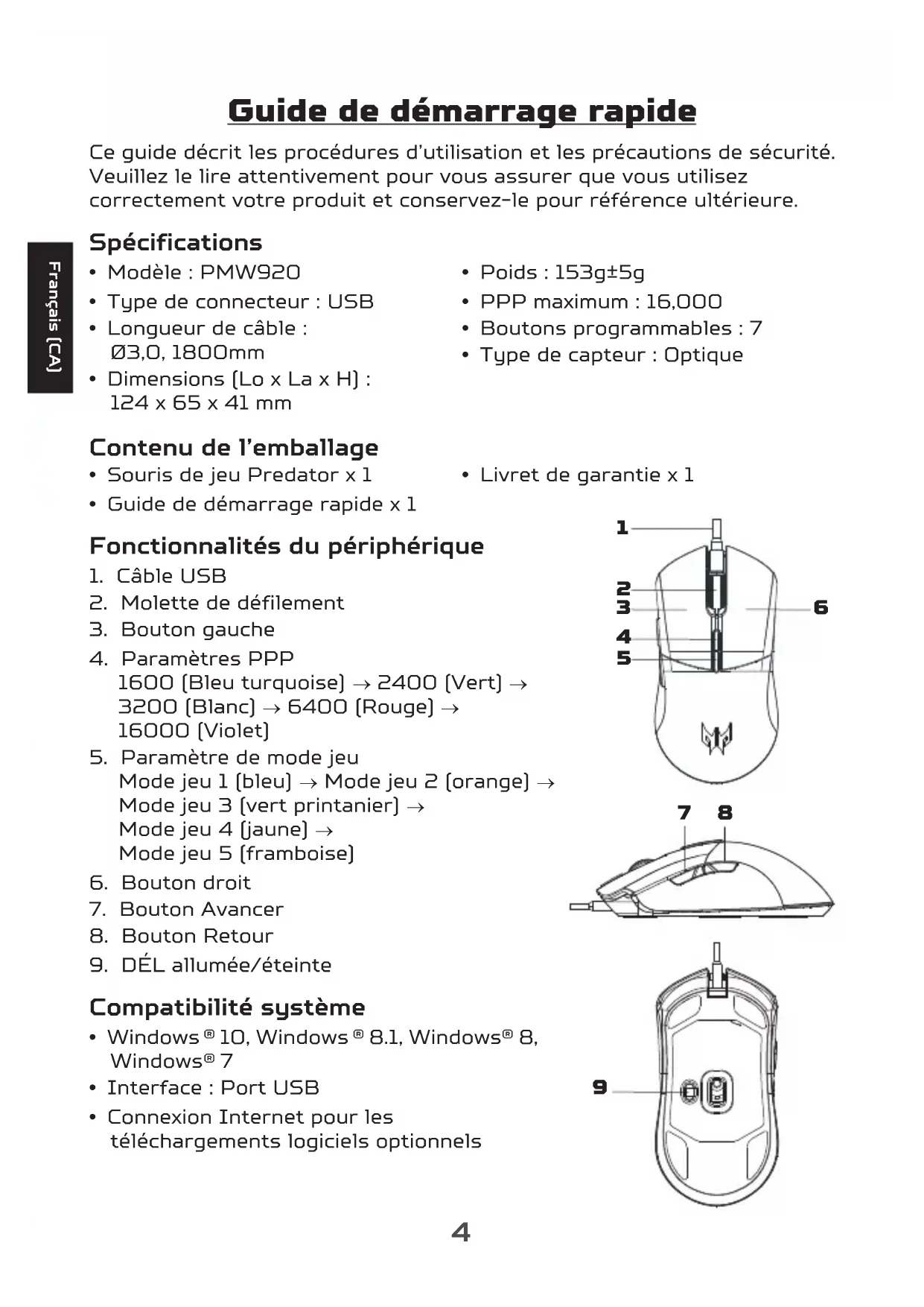 - Consult the dealer or an experienced radio/TV technician for help. FCC Caution: Any changes or modifications not expressly approved by the party responsible for compliance could void the user's authority to operate this equipment. Notice: Canadian users CAN ICES-3(B)/NMB-3(B) Please visit www.acer.com/predator for warranty.4 Français (CA) Guide de démarrage rapide Ce guide décrit les procédures d’utilisation et les précautions de sécurité. Veuillez le lire attentivement pour vous assurer que vous utilisez correctement votre produit et conservez-le pour référence ultérieure. Spécifications