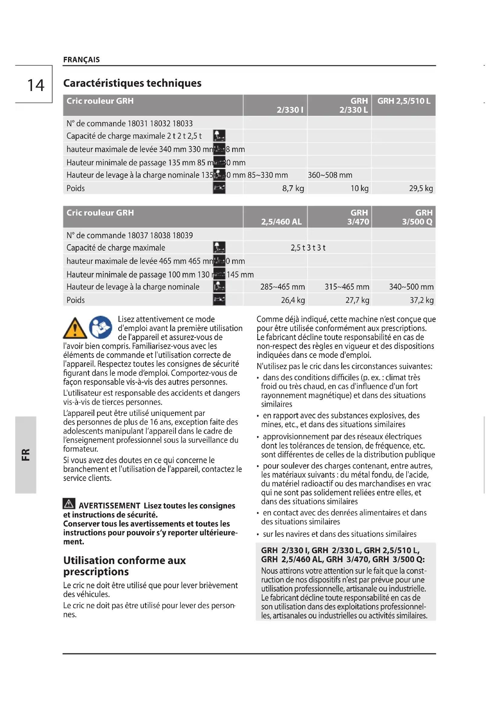 FRANÇAIS Caractéristiques techniques Cric rouleur GRH 2/330 I GRH 2/330 L GRH 2,5/510 L N° de commande 18031 18032 18033 Capacité de charge maximale 2 t 2 t 2,5 t hauteur maximale de levée 340 mm 330 mm 508 mm Hauteur minimale de passage 135 mm 85 mm 80 mm Hauteur de levage à la charge nominale 135~340 mm 85~330 mm 360~508 mm Poids 8,7 kg 10 kg 29,5 kg Cric rouleur GRH 2,5/460 AL GRH 3/470 GRH 3/500 Q N° de commande 18037 18038 18039 Capacité de charge maximale 2,5 t 3 t 3 t hauteur maximale de levée 465 mm 465 mm 500 mm Hauteur minimale de passage 100 mm 130 mm 145 mm Hauteur de levage à la charge nominale 285~465 mm 315~465 mm 340~500 mm Poids 26,4 kg 27,7 kg 37,2 kg Lisez attentivement ce mode d'emploi avant la première utilisation de l'appareil et assurez-vous de l'avoir bien compris. Familiarisez-vous avec les éléments de commande et l'utilisation correcte de l'appareil. Respectez toutes les consignes de sécurité gurant dans le mode d’emploi. Comportez-vous de façon responsable vis-à-vis des autres personnes. L'utilisateur est responsable des accidents et dangers vis-à-vis de tierces personnes. L’appareil peut être utilisé uniquement par despersonnes de plus de 16 ans, exception faite des adolescents manipulant l’appareil dans lecadre de l’enseignement professionnel sous la surveillancedu formateur. Si vous avez des doutes en ce qui concerne le branchement et l'utilisation de l'appareil, contactez le service clients. AVERTISSEMENT Lisez toutes les consignes et instructions de sécurité. Conserver tous les avertissements et toutes les instructions pour pouvoir s‘y reporter ultérieure- ment. Utilisation conforme aux prescriptions Le cric ne doit être utilisé que pour lever brièvement des véhicules. Le cric ne doit pas être utilisé pour lever des person