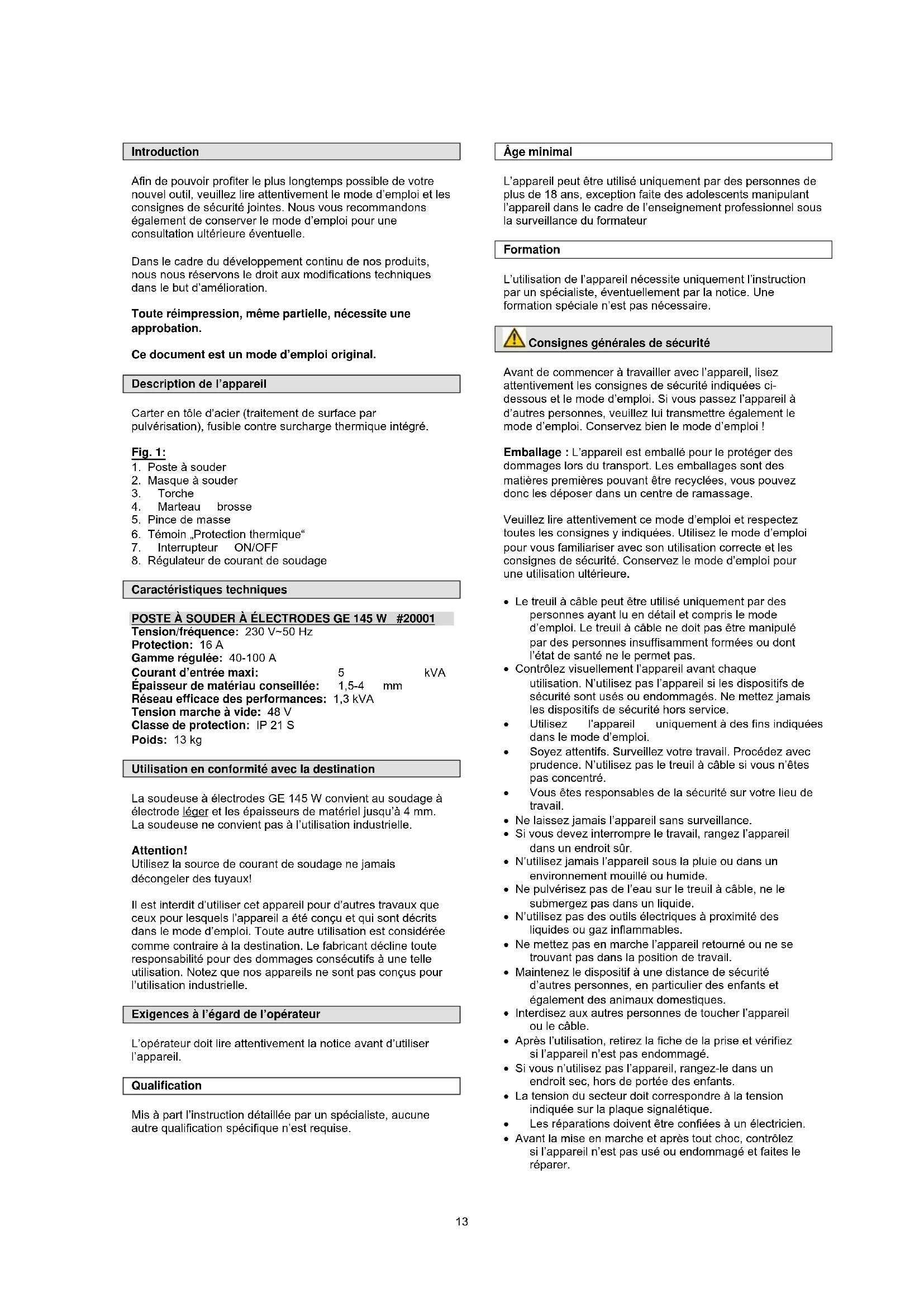 Tension/fréquence: 230 V~50 Hz Protection: 16 A Gamme régulée: 40-100 A Courant d’entrée maxi: 5 kVA Épaisseur de matériau conseillée: 1,5-4 mm Réseau efficace des performances: 1,3 kVA Tension marche à vide: 48 V Classe de protection: IP 21 S Poids: 13 kg Utilisation en conformité avec la destination La soudeuse à électrodes GE 145 W convient au soudage à électrode léger et les épaisseurs de matériel jusqu’à 4 mm. La soudeuse ne convient pas à l’utilisation industrielle. Attention! Utilisez la source de courant de soudage ne jamais décongeler des tuyaux! Il est interdit d’utiliser cet appareil pour d’autres travaux que ceux pour lesquels l’appareil a été conçu et qui sont décrits dans le mode d’emploi. Toute autre utilisation est considérée comme contraire à la destination. Le fabricant décline toute responsabilité pour des dommages consécutifs à une telle utilisation. Notez que nos appareils ne sont pas conçus pour l’utilisation industrielle. Exigences à l’égard de l’opérateur L’opérateur doit lire attentivement la notice avant d’utiliser l’appareil. Qualification Mis à part l’instruction détaillée par un spécialiste, aucune autre qualification spécifique n’est requise.