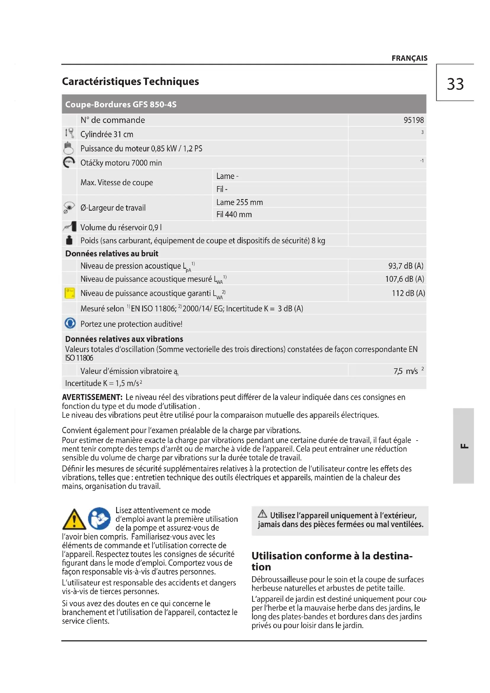 Max. Vitesse de coupe Lame - Fil - Ø-Largeur de travail Lame 255 mm Fil 440 mm Volume du réservoir 0,9 l Poids (sans carburant, équipement de coupe et dispositifs de sécurité) 8 kg