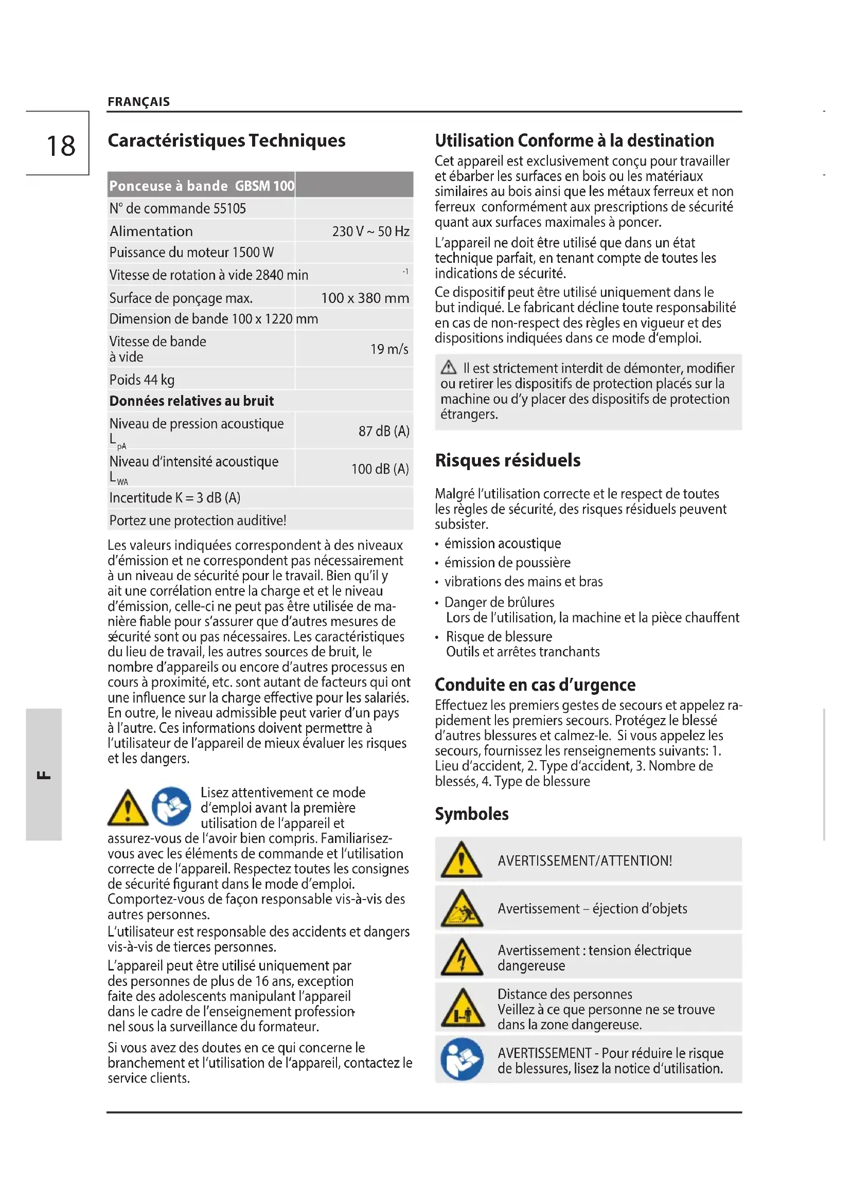 FRANÇAIS Caractéristiques Techniques Ponceuse à bande GBSM 100 N° de commande 55105 Alimentation 230 V ~ 50 Hz Puissance du moteur 1500 W Vitesse de rotation à vide 2840 min