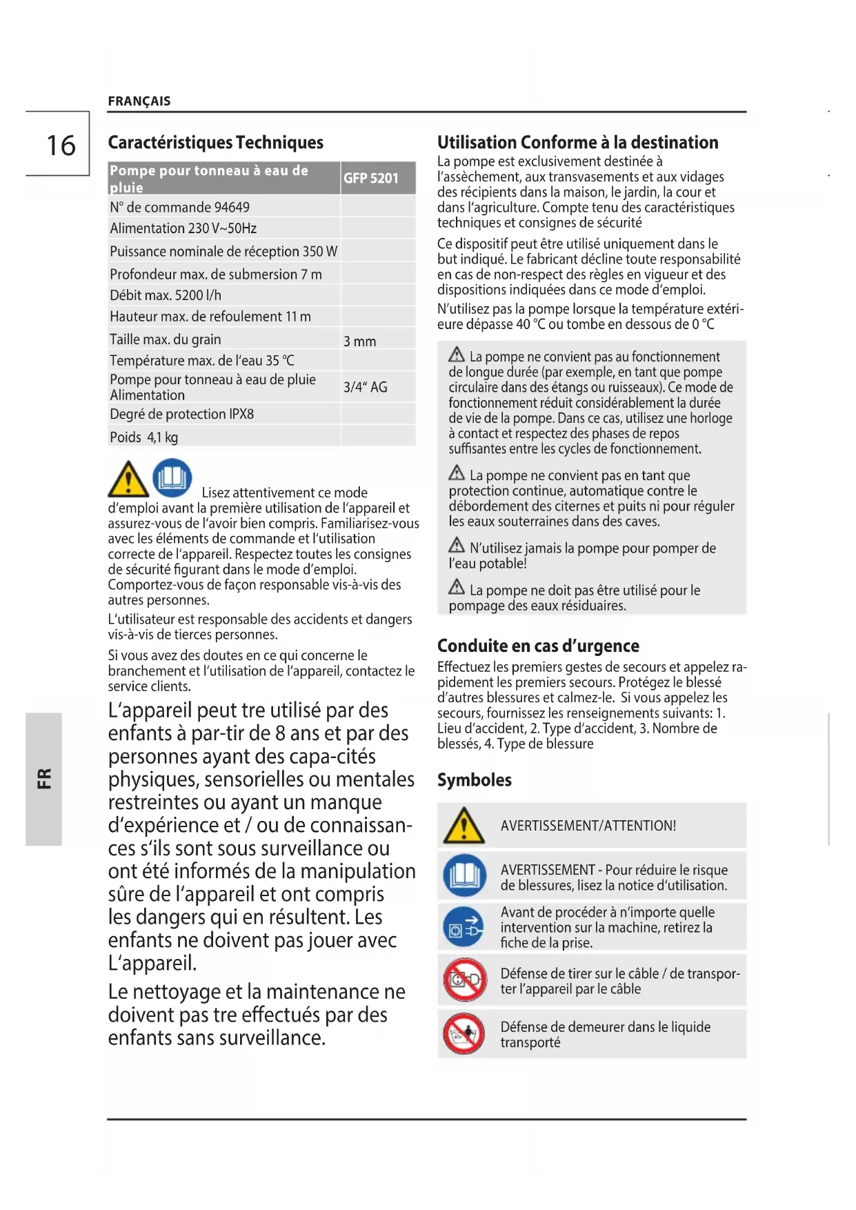FRANÇAIS Caractéristiques Techniques Pompe pour tonneau à eau de pluie GFP 5201 N° de commande 94649 Alimentation 230 V~50Hz Puissance nominale de réception 350 W Profondeur max. de submersion 7 m Débit max. 5200 l/h Hauteur max. de refoulement 11 m Taille max. du grain 3 mm Température max. de l‘eau 35 °C Pompe pour tonneau à eau de pluie Alimentation 3/4“ AG Degré de protection IPX8 Poids 4,1 kg Lisez attentivement ce mode d‘emploi avant la première utilisation de l‘appareil et assurez-vous de l‘avoir bien compris. Familiarisez-vous avec les éléments de commande et l‘utilisation correcte de l‘appareil. Respectez toutes les consignes de sécurité gurant dans le mode d’emploi. Comportez-vous de façon responsable vis-à-vis des autres personnes. L‘utilisateur est responsable des accidents et dangers vis-à-vis de tierces personnes. Si vous avez des doutes en ce qui concerne le branchement et l‘utilisation de l‘appareil, contactez le service clients. L‘appareil peut tre utilisé par des enfants à par-tir de 8 ans et par des personnes ayant des capa-cités physiques, sensorielles ou mentales restreintes ou ayant un manque d‘expérience et / ou de connaissan- ces s‘ils sont sous surveillance ou ont été informés de la manipulation sûre de l‘appareil et ont compris les dangers qui en résultent. Les enfants ne doivent pas jouer avec L‘appareil. Le nettoyage et la maintenance ne doivent pas tre eectués par des enfants sans surveillance. Utilisation Conforme à la destination La pompe est exclusivement destinée à l‘assèchement, aux transvasements et aux vidages des récipients dans la maison, le jardin, la cour et dans l‘agriculture. Compte tenu des caractéristiques techniques et consignes de sécurité Ce dispositif peut être utilisé uniquement dans le but indiqué. Le fabricant décline toute responsabilité en cas de non-respect des règles en vigueur et des dispositions indiquées dans ce mode d‘emploi. N’utilisez pas la pompe lorsque la température extéri