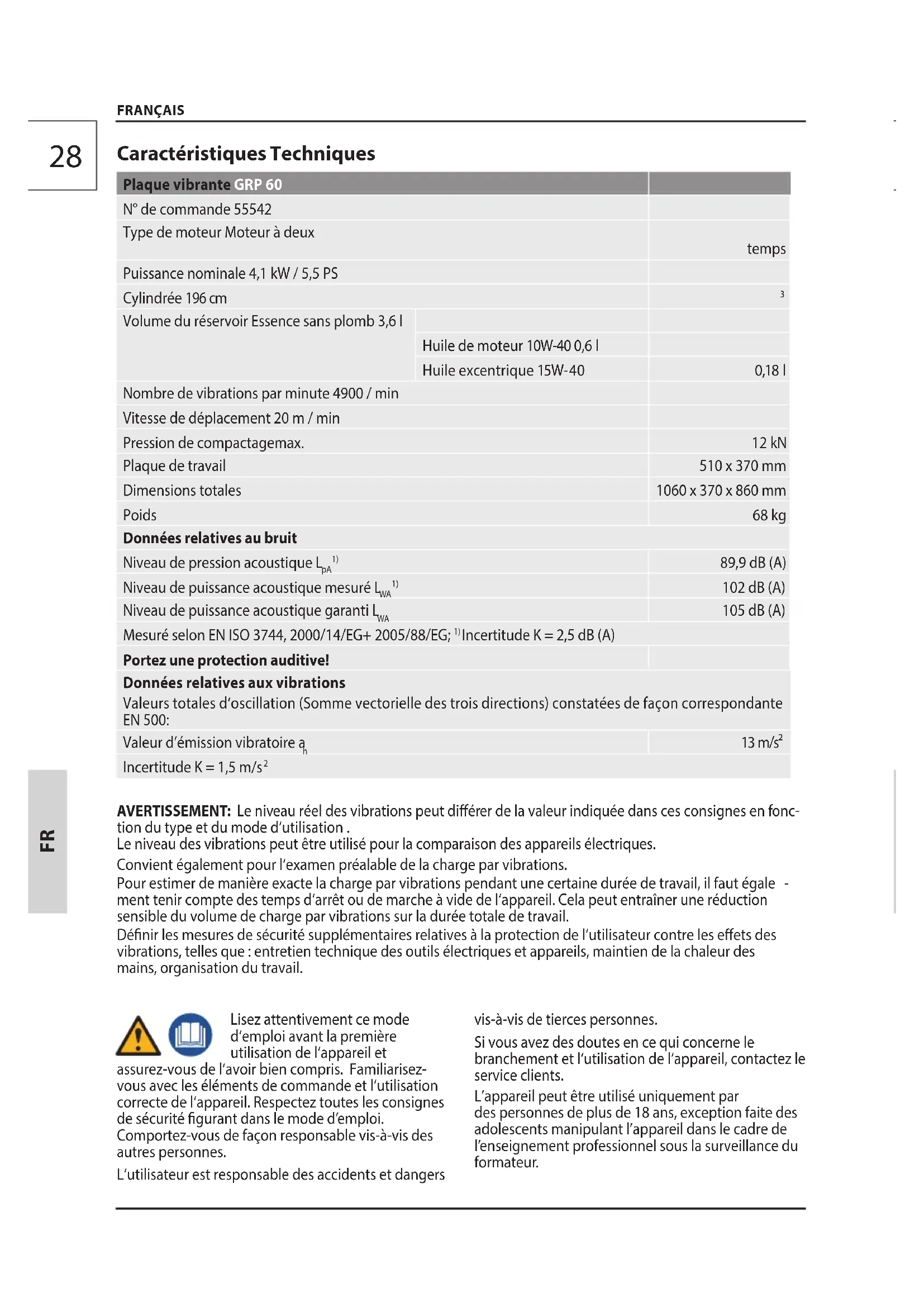 Volume du réservoir Essence sans plomb 3,6 l Huile de moteur 10W-40 0,6 l Huile excentrique 15W-40 0,18 l Nombre de vibrations par minute 4900 / min Vitesse de déplacement 20 m / min Pression de compactagemax. 12 kN Plaque de travail 510 x 370 mm Dimensions totales 1060 x 370 x 860 mm Poids 68 kg Données relatives au bruit Niveau de pression acoustique L