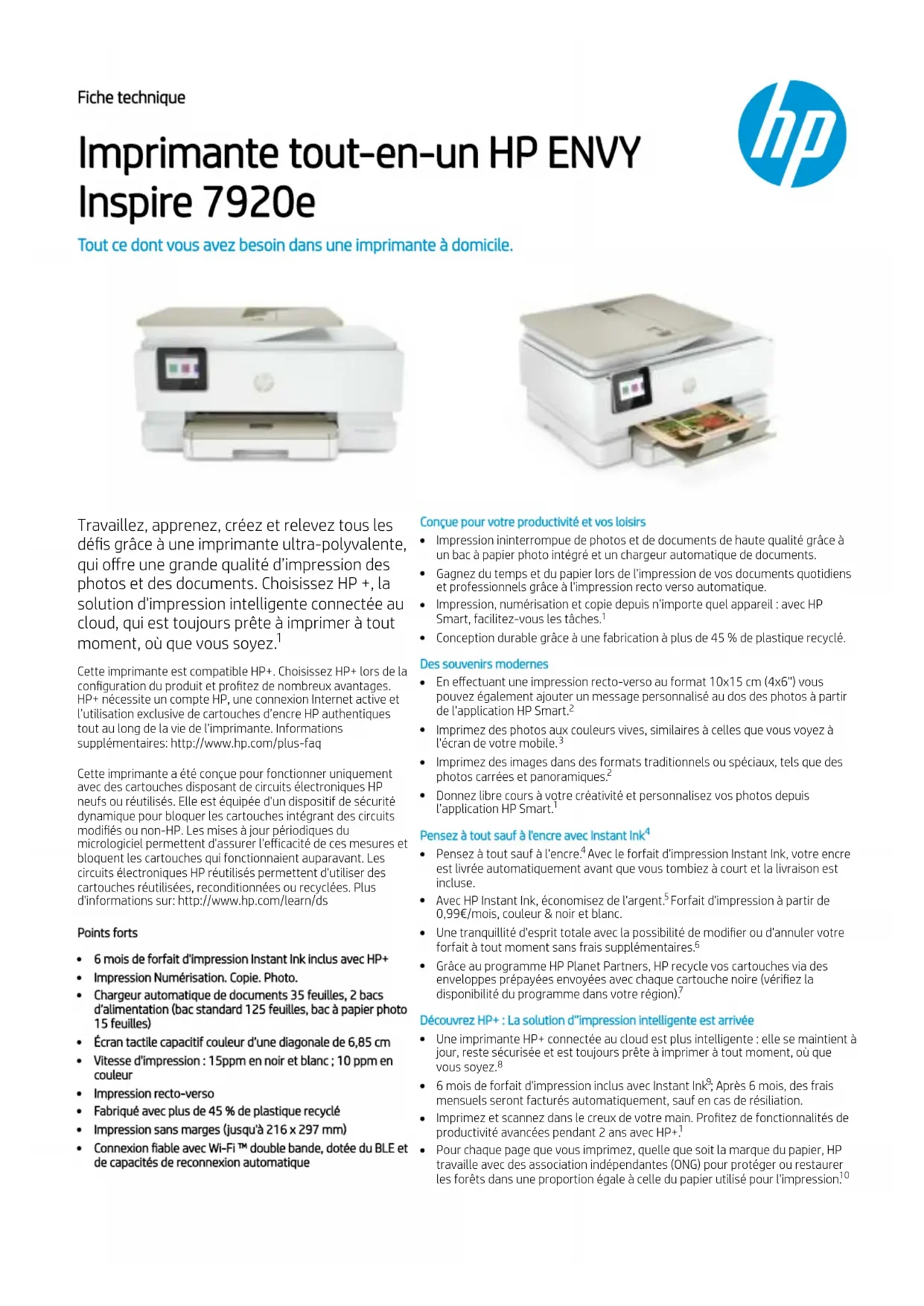 Fiche technique Imprimante tout-en-un HP ENVY Inspire 7920e Tout ce dont vous avez besoin dans une imprimante à domicile. Travaillez, apprenez, créez et relevez tous les dés grâce à une imprimante ultra-polyvalente, qui offre une grande qualité d’impression des photos et des documents. Choisissez HP +, la solution d'impression intelligente connectée au cloud, qui est toujours prête à imprimer à tout moment, où que vous soyez. Cette imprimante est compatible HP+. Choisissez HP+ lors de la conguration du produit et protez de nombreux avantages. HP+ nécessite un compte HP, une connexion Internet active et l’utilisation exclusive de cartouches d’encre HP authentiques tout au long de la vie de l’imprimante. Informations supplémentaires: http://www.hp.com/plus-faq Cette imprimante a été conçue pour fonctionner uniquement avec des cartouches disposant de circuits électroniques HP neufs ou réutilisés. Elle est équipée d'un dispositif de sécurité dynamique pour bloquer les cartouches intégrant des circuits modiés ou non-HP. Les mises à jour périodiques du micrologiciel permettent d'assurer l'efficacité de ces mesures et bloquent les cartouches qui fonctionnaient auparavant. Les circuits électroniques HP réutilisés permettent d'utiliser des cartouches réutilisées, reconditionnées ou recyclées. Plus d'informations sur: http://www.hp.com/learn/ds Points forts 6 mois de forfait d'impression Instant Ink inclus avec HP+ Impression Numérisation. Copie. Photo. Chargeur automatique de documents 35 feuilles, 2 bacs d’alimentation (bac standard 125 feuilles, bac à papier photo 15 feuilles) Écran tactile capacitif couleur d’une diagonale de 6,85 cm Vitesse d'impression : 15ppm en noir et blanc ; 10 ppm en couleur Impression recto-verso Fabriqué avec plus de 45 % de plastique recyclé Impression sans marges (jusqu'à 216 x 297mm) Connexion able avec Wi-Fi ™ double bande, dotée du BLE et de capacités de reconnexion automatique Conçue pour votre productivité et vos loisirs Impression ininterrompue de photos et de documents de haute qualité grâce à un bac à papier photo intégré et un chargeur automatique de documents. Gagnez du temps et du papier lors de l'impression de vos documents quotidiens et professionnels grâce à l'impression recto verso automatique. Impression, numérisation et copie depuis n’importe quel appareil : avec HP Smart, facilitez-vous les tâches. Conception durable grâce à une fabrication à plus de 45 % de plastique recyclé. Des souvenirs modernes En effectuant une impression recto-verso au format 10x15 cm (4x6'') vous pouvez également ajouter un message personnalisé au dos des photos à partir de l'application HP Smart. Imprimez des photos aux couleurs vives, similaires à celles que vous voyez à l'écran de votre mobile. Imprimez des images dans des formats traditionnels ou spéciaux, tels que des photos carrées et panoramiques. Donnez libre cours à votre créativité et personnalisez vos photos depuis l’application HP Smart. Pensez à tout sauf à l'encre avec Instant Ink Pensez à tout sauf à l'encre. Avec le forfait d'impression Instant Ink, votre encre est livrée automatiquement avant que vous tombiez à court et la livraison est incluse. Avec HP Instant Ink, économisez de l'argent. Forfait d'impression à partir de 0,99€/mois, couleur & noir et blanc. Une tranquillité d'esprit totale avec la possibilité de modier ou d'annuler votre forfait à tout moment sans frais supplémentaires. Grâce au programme HP Planet Partners, HP recycle vos cartouches via des enveloppes prépayées envoyées avec chaque cartouche noire (vériez la disponibilité du programme dans votre région). Découvrez HP+ : La solution d'’impression intelligente est arrivée Une imprimante HP+ connectée au cloud est plus intelligente : elle se maintient à jour, reste sécurisée et est toujours prête à imprimer à tout moment, où que vous soyez. 6 mois de forfait d'impression inclus avec Instant Ink ; Après 6 mois, des frais mensuels seront facturés automatiquement, sauf en cas de résiliation. Imprimez et scannez dans le creux de votre main. Protez de fonctionnalités de productivité avancées pendant 2 ans avec HP+. Pour chaque page que vous imprimez, quelle que soit la marque du papier, HP travaille avec des association indépendantes (ONG) pour protéger ou restaurer les forêts dans une proportion égale à celle du papier utilisé pour l'impression.
