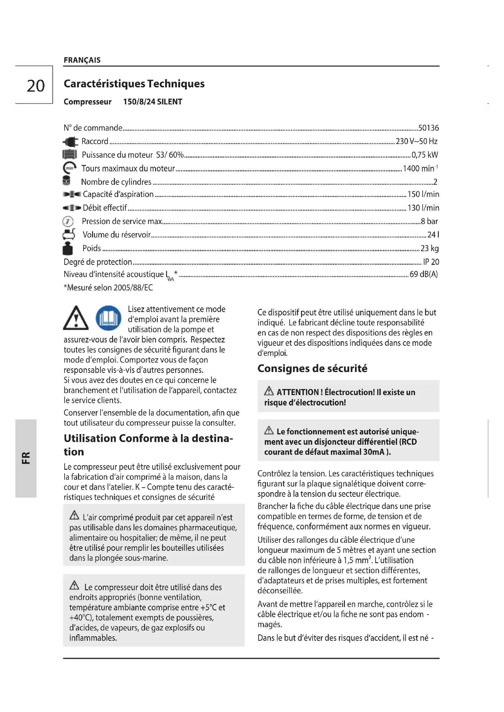 Lisez attentivement ce mode d‘emploi avant la première utilisation de la pompe et assurez-vous de l‘avoir bien compris. Respectez toutes les consignes de sécurité gurant dans le mode d’emploi. Comportez vous de façon responsable vis-à-vis d’autres personnes. Si vous avez des doutes en ce qui concerne le branchement et l‘utilisation de l‘appareil, contactez le service clients. Conserver l’ensemble de la documentation, an que tout utilisateur du compresseur puisse la consulter. Utilisation Conforme à la destina- tion Le compresseur peut être utilisé exclusivement pour la fabrication d‘air comprimé à la maison, dans la cour et dans l‘atelier. K – Compte tenu des caracté- ristiques techniques et consignes de sécurité L’air comprimé produit par cet appareil n’est pas utilisable dans les domaines pharmaceutique, alimentaire ou hospitalier; de même, il ne peut être utilisé pour remplir les bouteilles utilisées dans la plongée sous-marine. Le compresseur doit être utilisé dans des endroits appropriés (bonne ventilation, température ambiante comprise entre +5°C et +40°C), totalement exempts de poussières, d’acides, de vapeurs, de gaz explosifs ou inammables. Ce dispositif peut être utilisé uniquement dans le but indiqué. Le fabricant décline toute responsabilité en cas de non respect des dispositions des règles en vigueur et des dispositions indiquées dans ce mode d‘emploi. Consignes de sécurité ATTENTION ! Électrocution! Il existe un risque d’électrocution! Le fonctionnement est autorisé unique- ment avec un disjoncteur diérentiel (RCD courant de défaut maximal 30mA ). Contrôlez la tension. Les caractéristiques techniques gurant sur la plaque signalétique doivent corre