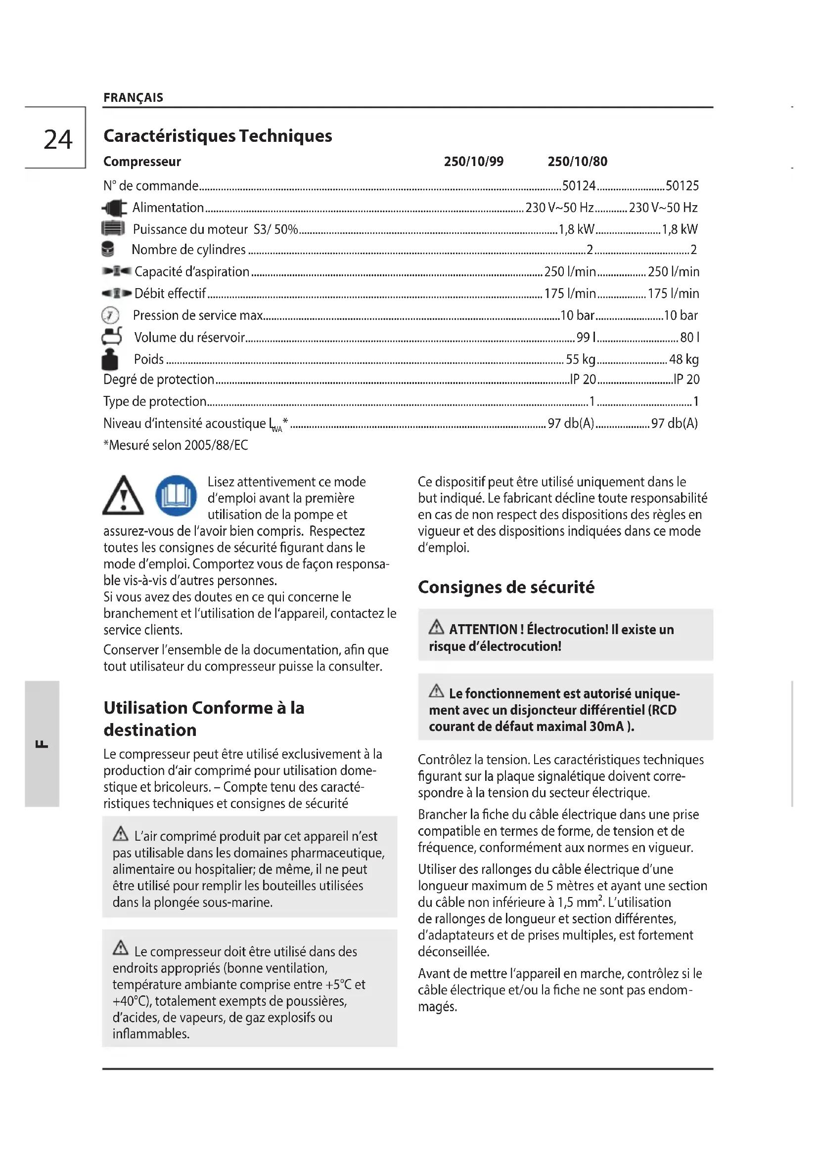 • .............................................................................................. 97 db(A) ....................97 db(A) *Mesuré selon 2005/88/EC Caractéristiques Techniques Compresseur 250/10/99 250/10/8025 Dans la mesure du possible, porter des équipements individuels de protection lors de l’utilisation des accessoires pneumatiques. Toujours respecter une distance de sécurité d’au moi
