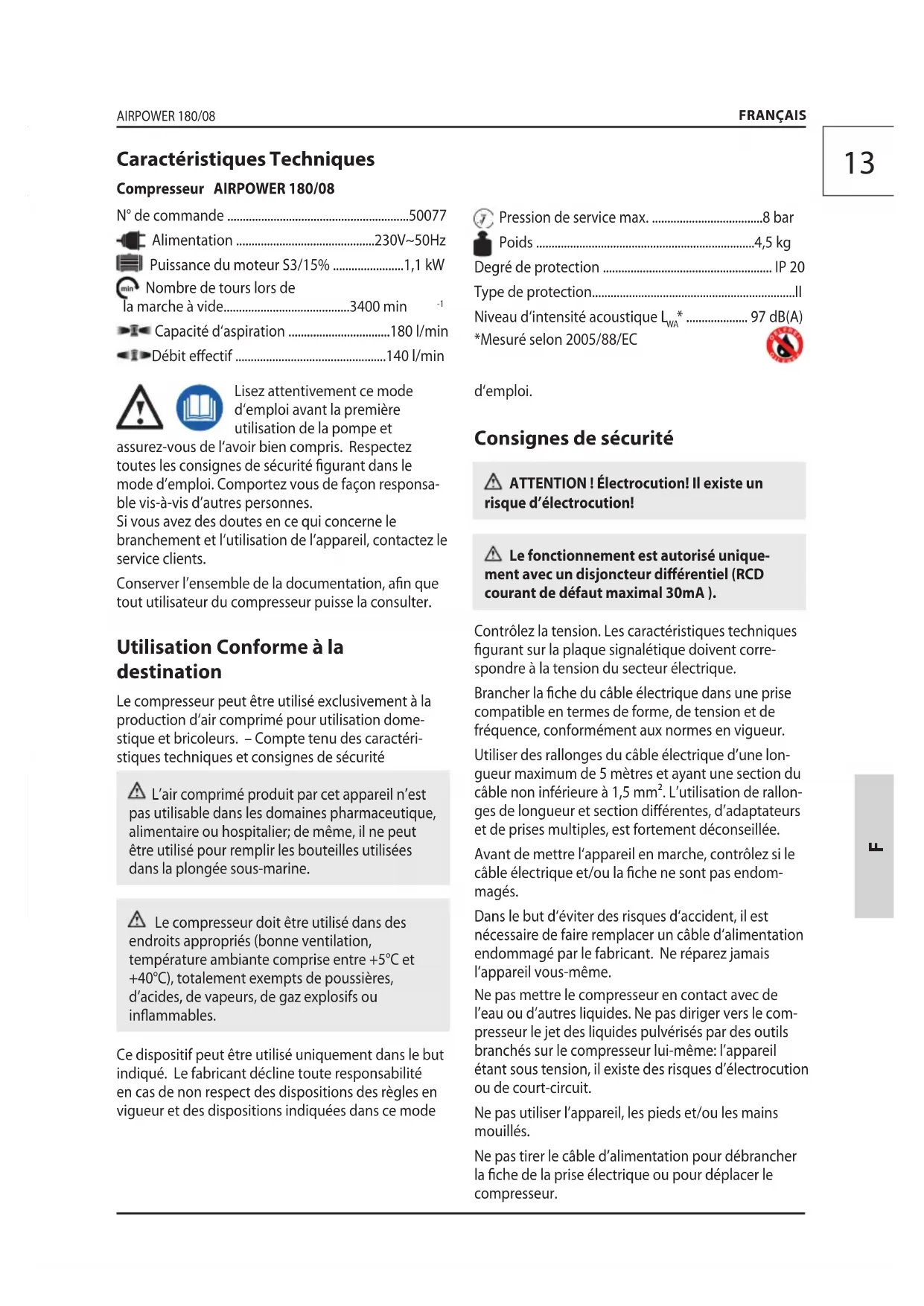 - .................... 97 dB(A) *Mesuré selon 2005/88/EC Caractéristiques Techniques Compresseur AIRPOWER 180/0814 AIRPOWER 180/08 FRANÇAIS