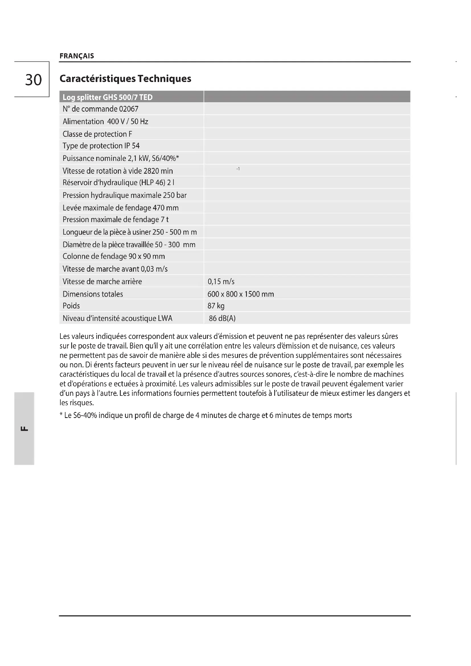 FRANÇAIS Caractéristiques Techniques Log splitter GHS 500/7 TED N° de commande 02067 Alimentation 400 V / 50 Hz Classe de protection F Type de protection IP 54 Puissance nominale 2,1 kW, S6/40%* Vitesse de rotation à vide 2820 min