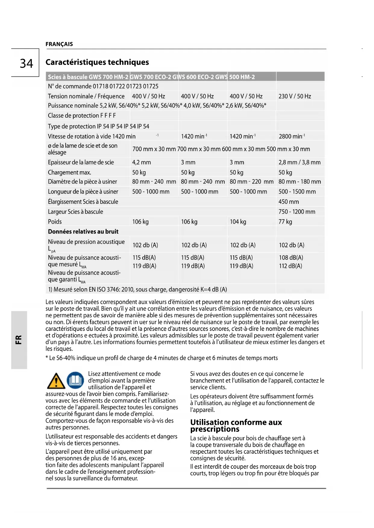 L‘appareil peut être branché uniquement à une prise de 400 Vavec sécurité de 16 A. GWS 500 HM-2 L‘appareil peut être branché uniquement à une prise de 230 Vavec sécurité de 16 A. Portez une protection acoustique. L‘exposition au bruit pourrait provoquer une diminution de l‘ouïe. Porter des gants lors de la manipulation des lames de scie et des matériaux bruts. La machine doit reposer pendant le fonctionnement sur un sol horizontal et droit et le sol autour de la ma