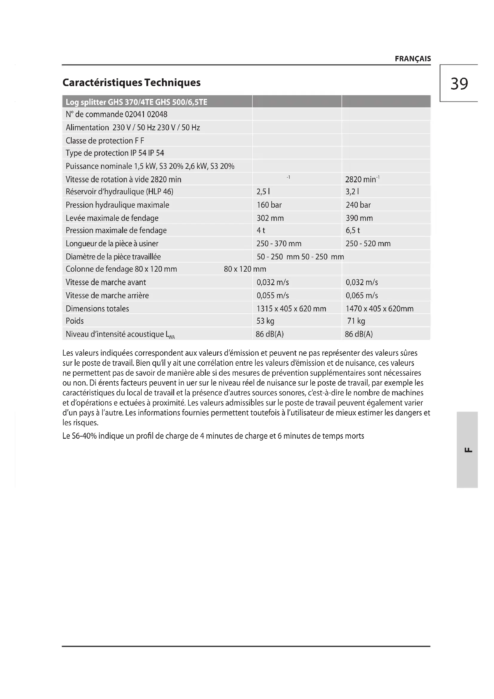 Réservoir d‘hydraulique (HLP 46) 2,5 l 3,2 l Pression hydraulique maximale 160 bar 240 bar Levée maximale de fendage 302 mm 390 mm Pression maximale de fendage 4 t 6,5 t Longueur de la pièce à usiner 250 - 370 mm 250 - 520 mm Diamètre de la pièce travaillée 50 - 250 mm 50 - 250 mm Colonne de fendage 80 x 120 mm 80 x 120 mm Vitesse de marche avant 0,032 m/s 0,032 m/s Vitesse de marche arrière 0,055 m/s 0,065 m/s Dimensions totales 1315 x 405 x 620 mm 1470 x 405 x 620mm Poids 53 kg 71 kg Niveau d‘intensité acoustique L