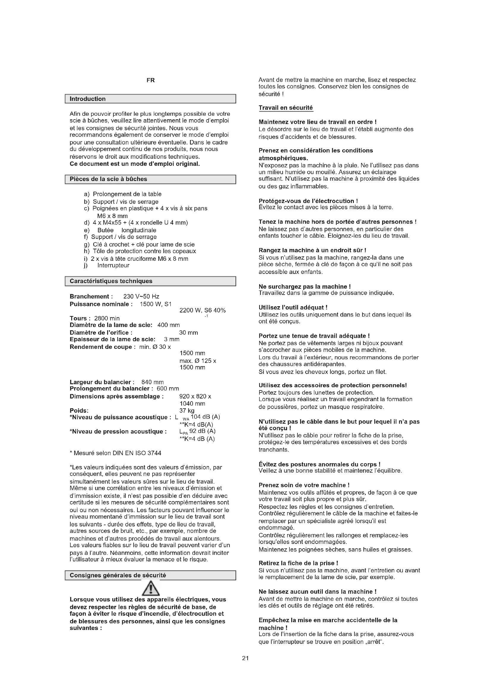 - Mesuré selon DIN EN ISO 3744 *Les valeurs indiquées sont des valeurs d’émission, par conséquent, elles peuvent ne pas représenter simultanément les valeurs sûres sur le lieu de travail. Même si une corrélation entre les niveaux d’émission et d’immission existe, il n’est pas possible d’en déduire avec certitude si les mesures de sécurité complémentaires sont oui ou non nécessaires. Les facteurs pouvant influencer le niveau momentané d’immission sur le lieu de travail sont les suivants - durée des effets, type de lieu de travail, autres sources de bruit, etc., par exemple, nombre de machines et d’autres procédés de travail aux alentours. Les valeurs fiables sur le lieu de travail peuvent varier d’un pays à l’autre. Néanmoins, cette information devrait inciter l’utilisateur à mieux évaluer la menace et le risque. Consignes générales de sécurité Lorsque vous utilisez des appareils électriques, vous devez respecter les règles de sécurité de base, de façon à éviter le risque d’incendie, d’électrocution et de blessures des personnes, ainsi que les consignes suivantes : Avant de mettre la machine en marche, lisez et respectez toutes les consignes. Conservez bien les consignes de sécurité ! Travail en sécurité Maintenez votre lieu de travail en ordre ! Le désordre sur le lieu de travail et l’établi augmente des risques d’accidents et de blessures. Prenez en considération les conditions atmosphériques. N’exposez pas la machine à la pluie. Ne l’utilisez pas dans un milieu humide ou mouillé. Assurez un éclairage suffisant. N’utilisez pas la machine à proximité des liquides ou des gaz inflammables. Protégez-vous de l’électrocution ! Évitez le contact avec les pièces mises à la terre. Tenez la machine hors de portée d’autres personnes ! Ne laissez pas d’autres personnes, en particulier des enfants toucher le câble. Éloignez-les du lieu de travail. Rangez la machine à un endroit sûr ! Si vous n’utilisez pas la machine, rangez-la dans une pièce sèche, fermée à clé de façon à ce qu’il ne soit pas accessible aux enfants. Ne surchargez pas la machine ! Travaillez dans la gamme de puissance indiquée. Utilisez l’outil adéquat ! Utilisez les outils uniquement dans le but dans lequel ils ont été conçus. Portez une tenue de travail adéquate ! Ne portez pas de vêtements larges ni bijoux pouvant s’accrocher aux pièces mobiles de la machine. Lors du travail à l’extérieur, nous recommandons de porter des chaussures antidérapantes. Si vous avez les cheveux longs, portez un filet. Utilisez des accessoires de protection personnels! Portez toujours des lunettes de protection. Lorsque vous réalisez un travail engendrant la formation de poussières, portez un masque respiratoire. N’utilisez pas le câble dans le but pour lequel il n’a pas été conçu ! N’utilisez pas le câble pour retirer la fiche de la prise, protégez-le des températures excessives et des bords tranchants. Évitez des postures anormales du corps ! Veillez à une bonne stabilité et maintenez l’équilibre. Prenez soin de votre machine ! Maintenez vos outils affûtés et propres, de façon à ce que votre travail soit plus propre et plus sûr. Respectez les règles et les consignes d’entretien. Contrôlez régulièrement le câble de la machine et faites-le remplacer par un spécialiste agréé lorsqu’il est endommagé. Contrôlez régulièrement les rallonges et remplacez-les lorsqu’elles sont endommagées. Maintenez les poignées sèches, sans huiles et graisses. Retirez la fiche de la prise ! Si vous n’utilisez pas la machine, avant l’entretien ou avant le remplacement de la lame de scie, par exemple. Ne laissez aucun outil dans la machine ! Avant de mettre la machine en marche, contrôlez si toutes les clés et outils de réglage ont été retirés. Empêchez la mise en marche accidentelle de la machine ! Lors de l’insertion de la fiche dans la prise, assurez-vous que l’interrupteur se trouve en position „arrêt“. 21Rallonges pour l’utilisation extérieure : À l’extérieur, utilisez uniquement des rallonges autorisées avec marquage adéquat. Soyez attentifs. Faites attention à ce que vous faites. Utilisez le bon sens. N’utilisez pas la machine si vous êtes fatigués. Contrôlez la machine du point de vue d’un endommagement éventuel ! Avant de réutiliser la machine, contrôlez soigneusement le fonctionnement parfait de tous les dispositifs de protection ou des pièces légèrement endommagées. Contrôlez si les pièces rotatives fonctionnent parfaitement et ne coincent pas ou si les pièces ne sont pas endommagées. Toutes les pièces doivent être correctement montées et répondre à toutes les conditions afin que le fonctionnement parfait de la machine soit assuré. Les dispositifs et pièces de protection endommagés doivent être réparés ou remplacés par un atelier de dépannage agréé, sauf stipulation différente dans le mode d’emploi. Faites remplacer les interrupteurs endommagés par un service après-vente. N’utilisez pas la machine dont l’interrupteur ne fonctionne pas. AVERTISSEMENT ! L’utilisation d’autres accessoires peut engendrer des accidents. Confiez la réparation de votre machine à un électricien ! Cette machine répond aux dispositions de sécurité correspondantes. Les réparations doivent être confiées uniquement à un électricien utilisant uniquement des pièces détachées d’origine, faute de quoi l’utilisateur s’expose à des risques d’accident. Consignes de sécurité spécifiques pour la machine x Maintenez les outils affûtés et propres – votre travail sera ainsi plus sûr. x Utilisez le bon sens. N’utilisez pas la machine si vous êtes fatigués. x Attention ! La lame de scie en rotation représente un risque de blessure des mains et des doigts. x La machine est équipée d’un interrupteur de sécurité contre la remis