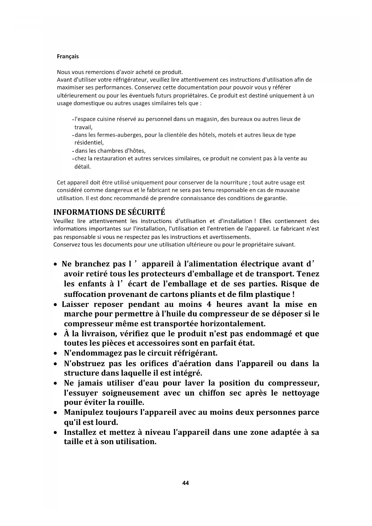 Para más información sobre el producto, consulte https://eprel.ec.europa.eu/ o escanee el QR en la etiqueta energética suministrada con el aparato.44 Français Nous vous remercions d'avoir acheté ce produit. Avant d'utiliser votre réfrigérateur, veuillez lire attentivement ces instructions d'utilisation afin de maximiser ses performances. Conservez cette documentation pour pouvoir vous y référer ultérieurement ou pour les éventuels futurs propriétaires. Ce produit est destiné uniquement à un usage domestique ou autres usages similaires tels que : - l'espace cuisine réservé au personnel dans un magasin, des bureaux ou autres lieux de travail, - dans les fermes-auberges, pour la clientèle des hôtels, motels et autres lieux de type résidentiel, - dans les chambres d'hôtes, - chez la restauration et autres services similaires, ce produit ne convient pas à la vente au détail. Cet appareil doit être utilisé uniquement pour conserver de la nourriture ; tout autre usage est considéré comme dangereux et le fabricant ne sera pas tenu responsable en cas de mauvaise utilisation. Il est donc recommandé de prendre connaissance des conditions de garantie.