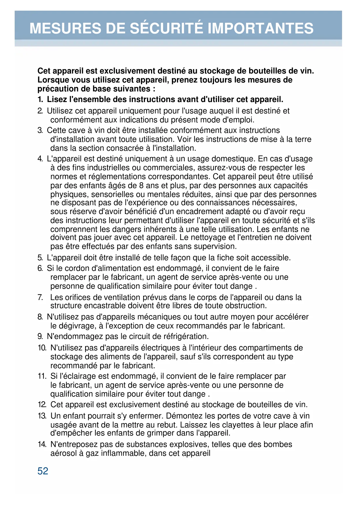 Cet appareil est exclusivement destiné au stockage de bouteilles de vin. Lorsque vous utilisez cet appareil, prenez toujours les mesures de précaution de base suivantes :