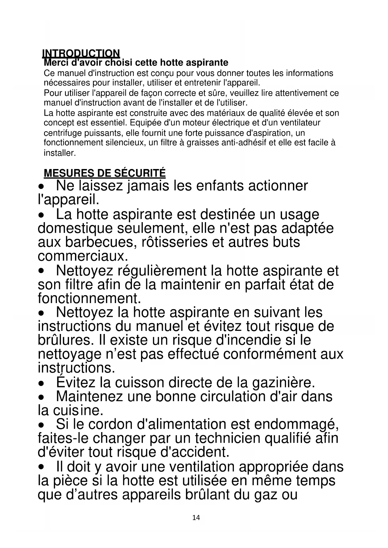 INTRODUCTION Merci d'avoir choisi cette hotte aspirante Ce manuel d'instruction est conçu pour vous donner toutes les informations nécessaires pour installer, utiliser et entretenir l'appareil. Pour utiliser l'appareil de façon correcte et sûre, veuillez lire attentivement ce manuel d'instruction avant de l'installer et de l'utiliser. La hotte aspirante est construite avec des matériaux de qualité élevée et son concept est essentiel. Equipée d'un moteur électrique et d'un ventilateur centrifuge puissants, elle fournit une forte puissance d'aspiration, un fonctionnement silencieux, un filtre à graisses anti-adhésif et elle est facile à installer.