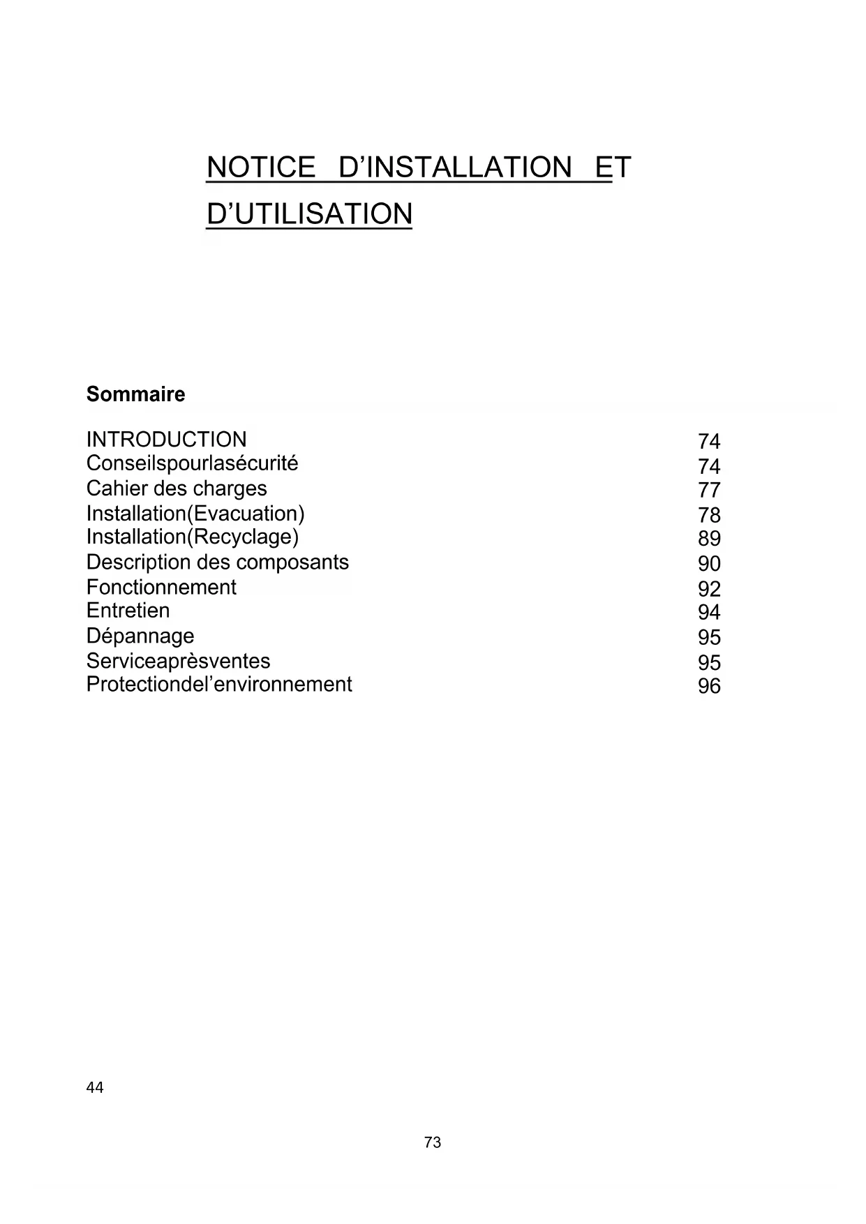 INTRODUCTION Conseils pour la sécurité Cahier des charges Installation (Evacuation) Installation (Recyclage) Description des composants Fonctionnement Entretien Dépannage Service après ventes Protection de l’environnement