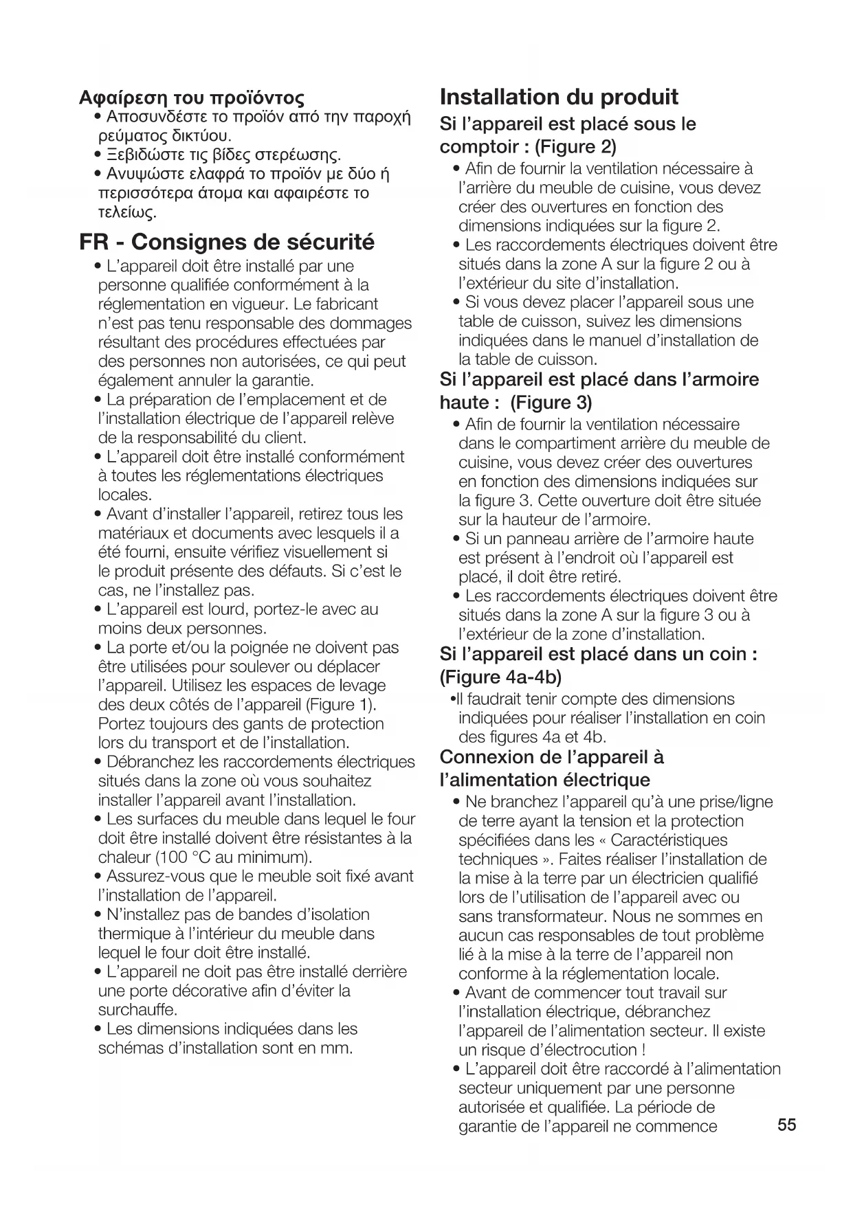 - Il faudrait tenir compte des dimensions indiquées pour réaliser l’installation en coin des figures 4a et 4b. Connexion de l’appareil à l’alimentation électrique
