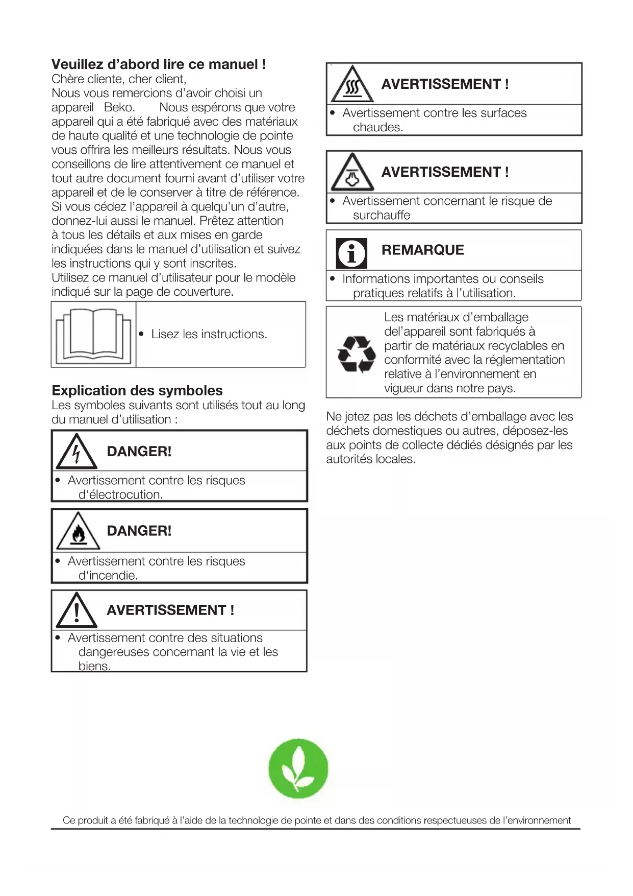 BEKO DU9112GA0 718248332022 Sèche-linge / Manuel de l’utilisateur Ce produit a été fabriqué à l’aide de la technologie de pointe et dans des conditions respectueuses de l’environnement Veuillez d’abord lire ce manuel ! Chère cliente, cher client, Nous vous remercions d’avoir choisi un appareil Beko. Nous espérons que votre appareil qui a été fabriqué avec des matériaux de haute qualité et une technologie de pointe vous offrira les meilleurs résultats. Nous vous conseillons de lire attentivement ce manuel et tout autre document fourni avant d’utiliser votre appareil et de le conserver à titre de référence. Si vous cédez l’appareil à quelqu’un d’autre, donnez-lui aussi le manuel. Prêtez attention à tous les détails et aux mises en garde indiquées dans le manuel d’utilisation et suivez les instructions qui y sont inscrites. Utilisez ce manuel d’utilisateur pour le modèle indiqué sur la page de couverture.