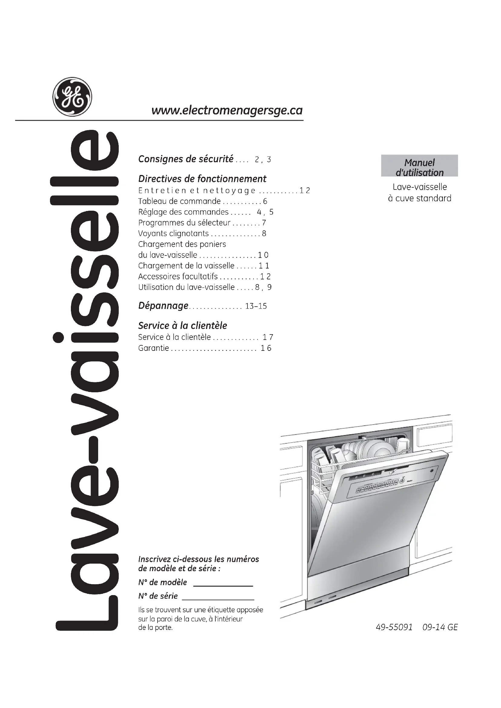 www.electromenagersge.ca Eau extrêmement dure Basse température de l‘eau Surcharge du lave- vaisselle Chargement incorrect Détergent en poudre «trop vieux» ou humide Distributeur de produit de rinçage vide Quantité insuffisante de détergent16 Pour une période de : GE remplacera : Un an Toute pièce du lave-vaisselle qui se casse à cause d’un vice de matériau ou de main-d’oeuvre. à partir de la date Au cours de cette année de garantie limitée, GE fournira, gratuitement, toute la main-d’oeuvre d’achat initial et le service à la maison nécessaires pour remplacer la pièce défectueuse. Ce qui n’est pas couvert : Tout déplacement de service chez vous pour vous apprendre à utiliser votre lave-vaisselle. Toute mauvaise installation. Si vous avez un problème d’installation, appelez votre revendeur ou un installateur. Vous êtes responsable de fournir une bonne alimentation électrique, un bon échappement et tout autre branchement nécessaire. Toute panne du produit s’il a été malmené, mal usé ou utilisé à une autre fin que celle prévue ou utilisé commercialement. Tout remplacement des fusibles de la maison ou tout rebranchement des disjoncteurs. Tout dommage occasionné par un accident, un incendie, une inondation ou un acte de Dieu. Tout dommage subi après la livraison. Le service s’il est impossible d’avoir accès au produit pour ce faire. Agrafez le reçu d’achat ici. Pour obtenir le service sous garantie, vous devrez fournir la preuve de l’achat original. Garantie GE sur les lave-vaisselle. Tout le service sous garantie est fourni par nos techniciens autorisés. Pour le service, appelez le 800.561.3344. Veuillez fournir le numéro de série et le numéro de modèle lorsque vous appelez pour obtenir le service. EXCLUSION DE GARANTIES IMPLICITES – Votre seul et unique recours est la réparation du produit selon les dispositions de cette Garantie limitée. Toutes les garanties implicites, incluant les garanties de commercialité et d’adéquation à un usage spécifique, sont limitées à une année ou à la période la plus courte autorisée par la législation. Cette garantie est valable pour le premier propriétaire et tout autre propriétaire du produit s’il acheté au Canada pour utilisation domestique au Canada. Le service à domicile sous garantie sera fourni là où il est disponible et dans les régions que Mabe considère que l’offre de service est raisonnable. Garant : MC COMMERCIAL, Burlington, L7R 5B6 LE GARANT N’EST PAS RESPONSABLE DES DOMMAGES INDIRECTS.17 Soutien au consommateur. Site Web appareils électroménagers GE www.electromenagersge.ca Vous avez une question ou vous avez besoin d’aide pour votre appareil électroménager? Contactez-nous par Internet au site www.electromenagersge.ca 24 heures par jour, tous les jours de l’année. Service de réparations 800.561.3344 Service de réparations GE est tout près de vous. Pour faire réparer votre électroménager GE, il suffit de nous téléphoner. Studio de conception réaliste Sur demande, GE peut fournir une brochure sur l’aménagement d’une cuisine pour les personnes à mobilité réduite. Appelez le 800.561.3344 Prolongation de garantie Veuillez consulter votre annuaire pour trouver un fournisseur de garantie prolongée local. Pièces et accessoires Les directives stipulées dans le présent manuel peuvent être effectuées par n’importe quel utilisateur. Les autres réparations doivent généralement être effectuées par un technicien qualifié. Soyez prudent, car une réparation inadéquate peut affecter le fonctionnement sécuritaire de l’appareil. Veuillez consulter votre annuaire pour trouver un distributeur local de pièces GE. Autrement, appelez-nous au 800.661.1616. Contactez-nous Si vous n’êtes pas satisfait du service après-vente dont vous avez bénéficié : Premièrement, communiquez avec les gens qui ont réparé votre appareil. Ensuite, si vous n’êtes toujours pas satisfait envoyez tous les détails–numéro de téléphone compris–au Directeur, Relations avec les consommateurs, MC Commercial Bureau 310, 1 Factory Lane Moncton, N.B. E1C 9M3 Inscrivez votre appareil électroménager www.electromenagersge.ca Inscrivez votre appareil électroménager en direct, aussitôt que possible. Cela améliorera nos communications et notre service après-vente. Vous pouvez également nous envoyer par la poste le formulaire d’inscription joint à votre documentation.18 Notes.Notes.