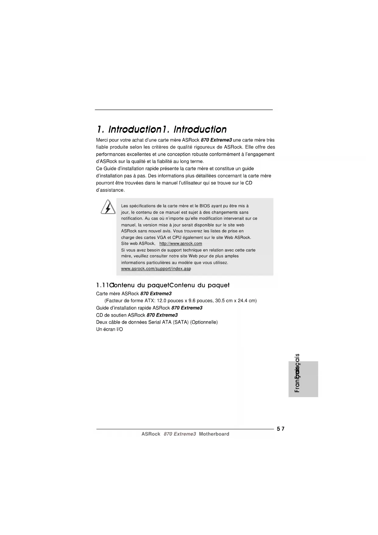 Contenu du paquetContenu du paquet Contenu du paquetContenu du paquet Contenu du paquet Carte mère ASRock 870 Extreme3 (Facteur de forme ATX: 12.0 pouces x 9.6 pouces, 30.5 cm x 24.4 cm) Guide d’installation rapide ASRock 870 Extreme3 CD de soutien ASRock 870 Extreme3 Deux câble de données Serial ATA (SATA) (Optionnelle) Un écran I/O FranFran FranFran Fran çaisçais çaisçais çais5858