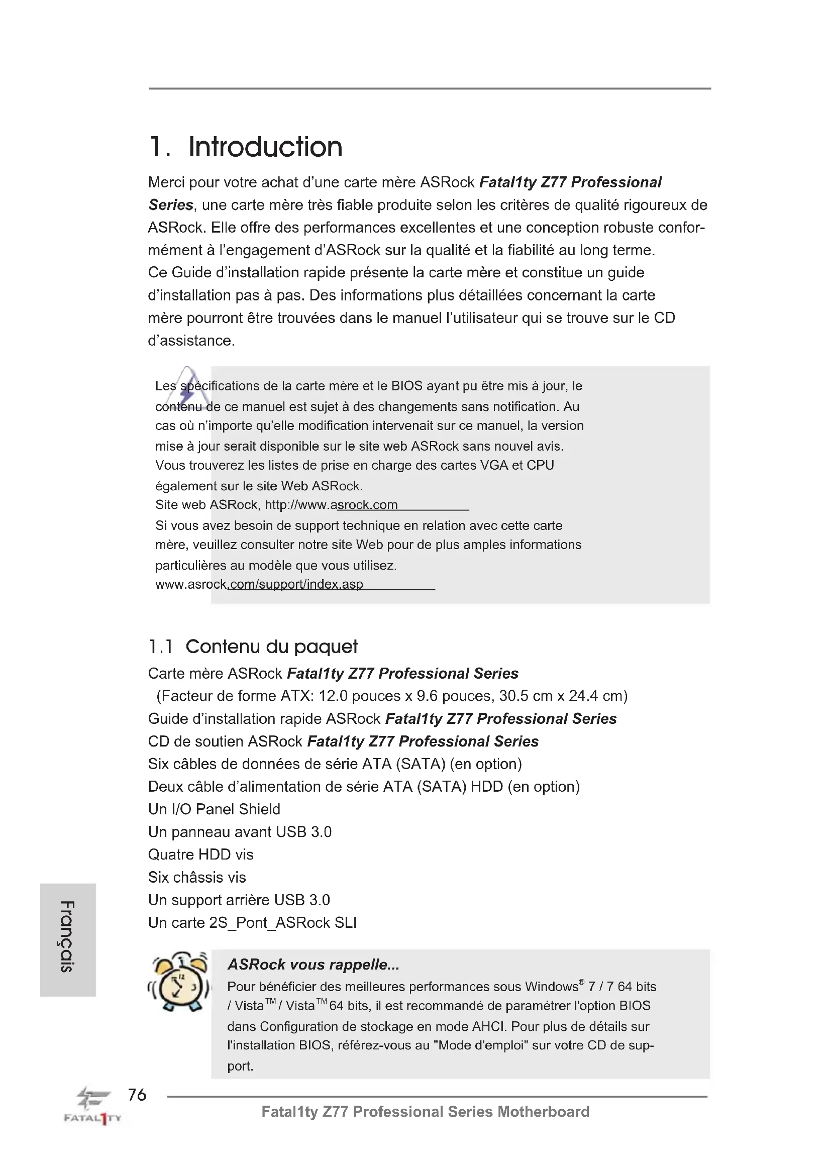 Merci pour votre achat d’une carte mère ASRock Fatal1ty Z77 Professional Series, une carte mère très able produite selon les critères de qualité rigoureux de ASRock. Elle offre des performances excellentes et une conception robuste confor- mément à l’engagement d’ASRock sur la qualité et la abilité au long terme. Ce Guide d’installation rapide présente la carte mère et constitue un guide d’installation pas à pas. Des informations plus détaillées concernant la carte mère pourront être trouvées dans le manuel l’utilisateur qui se trouve sur le CD d’assistance. Les spécications de la carte mère et le BIOS ayant pu être mis à jour, le contenu de ce manuel est sujet à des changements sans notication. Au cas où n’importe qu’elle modication intervenait sur ce manuel, la version mise à jour serait disponible sur le site web ASRock sans nouvel avis. Vous trouverez les listes de prise en charge des cartes VGA et CPU également sur le site Web ASRock. Site web ASRock, http://www.asrock.com Si vous avez besoin de support technique en relation avec cette carte mère, veuillez consulter notre site Web pour de plus amples informations particulières au modèle que vous utilisez. www.asrock.com/support/index.asp