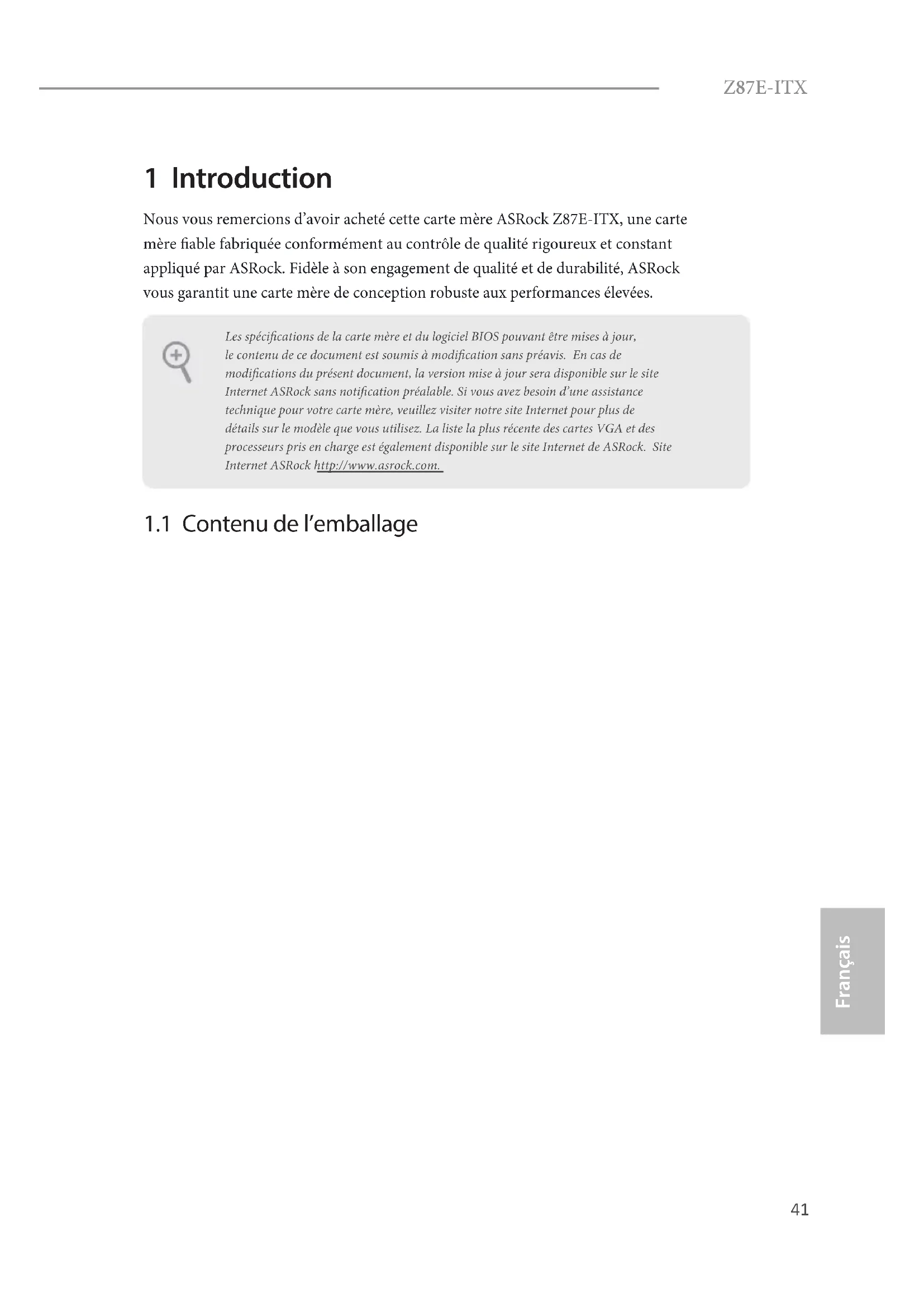 Français 1 Introduction Nous vous remercions d’avoir acheté cette carte mère ASRock Z87E-ITX, une carte mère able fabriquée conformément au contrôle de qualité rigoureux et constant appliqué par ASRock. Fidèle à son engagement de qualité et de durabilité, ASRock vous garantit une carte mère de conception robuste aux performances élevées.