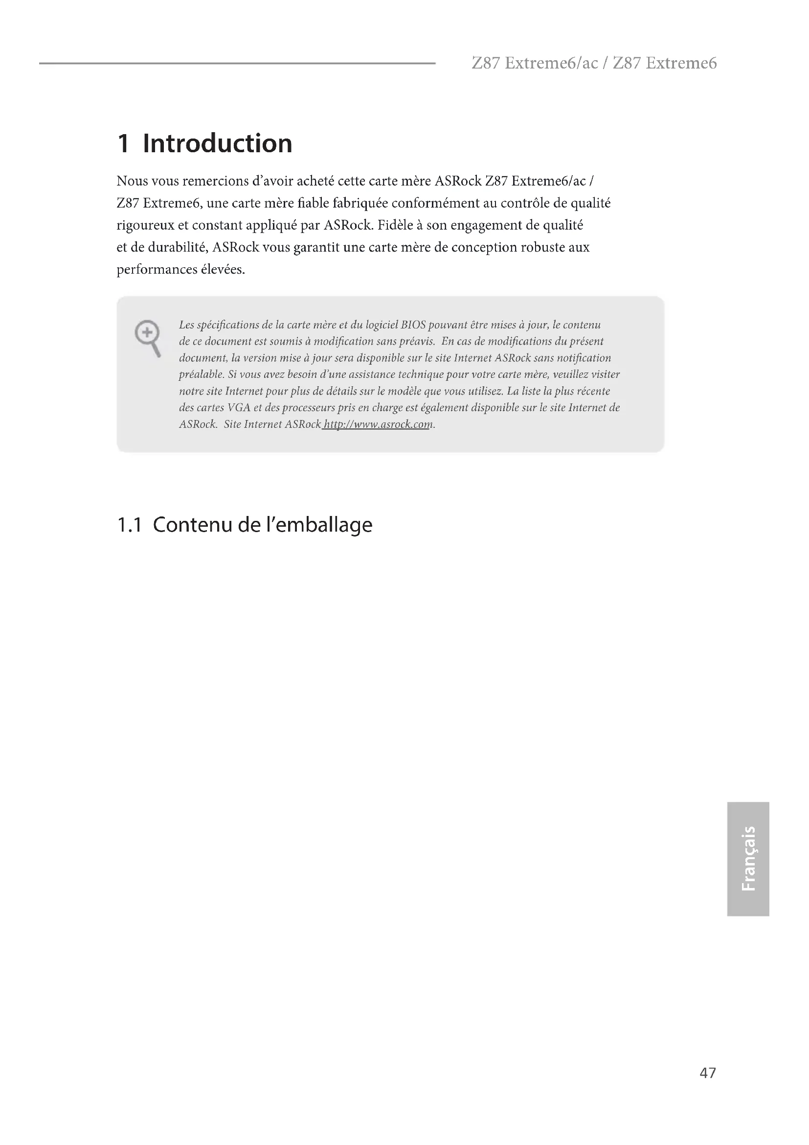 - 2 x câbles d’antenne Wi-Fi SMA (pour Z87 Extreme6/ac uniquement) Les spécications de la carte mère et du logiciel BIOS pouvant être mises à jour, le contenu de ce document est soumis à modication sans préavis. En cas de modications du présent document, la version mise à jour sera disponible sur le site Internet ASRock sans notication préalable. Si vous avez besoin d’une assistance technique pour votre carte mère, veuillez visiter notre site Internet pour plus de détails sur le modèle que vous utilisez. La liste la plus récente des cartes VGA et des processeurs pris en charge est également disponible sur le site Internet de ASRock. Site Internet ASRock http://www.asrock.com.48 Français
