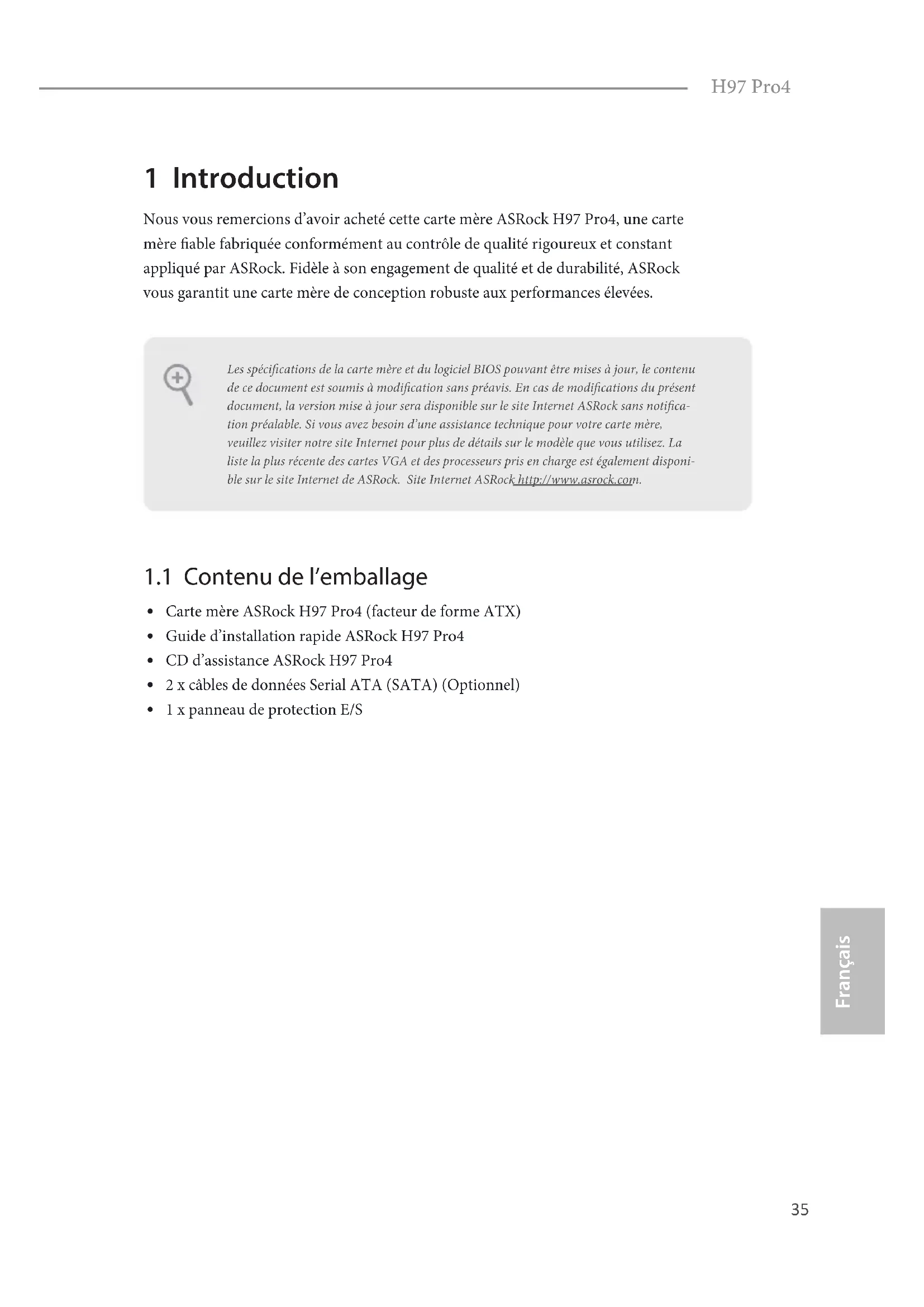 Français 1 Introduction Nous vous remercions d’avoir acheté cette carte mère ASRock H97 Pro4, une carte mère able fabriquée conformément au contrôle de qualité rigoureux et constant appliqué par ASRock. Fidèle à son engagement de qualité et de durabilité, ASRock vous garantit une carte mère de conception robuste aux performances élevées.