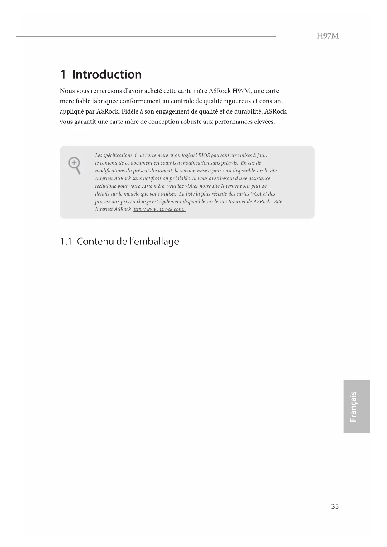 Français 1 Introduction Nous vous remercions d’avoir acheté cette carte mère ASRock H97M, une carte mère able fabriquée conformément au contrôle de qualité rigoureux et constant appliqué par ASRock. Fidèle à son engagement de qualité et de durabilité, ASRock vous garantit une carte mère de conception robuste aux performances élevées.