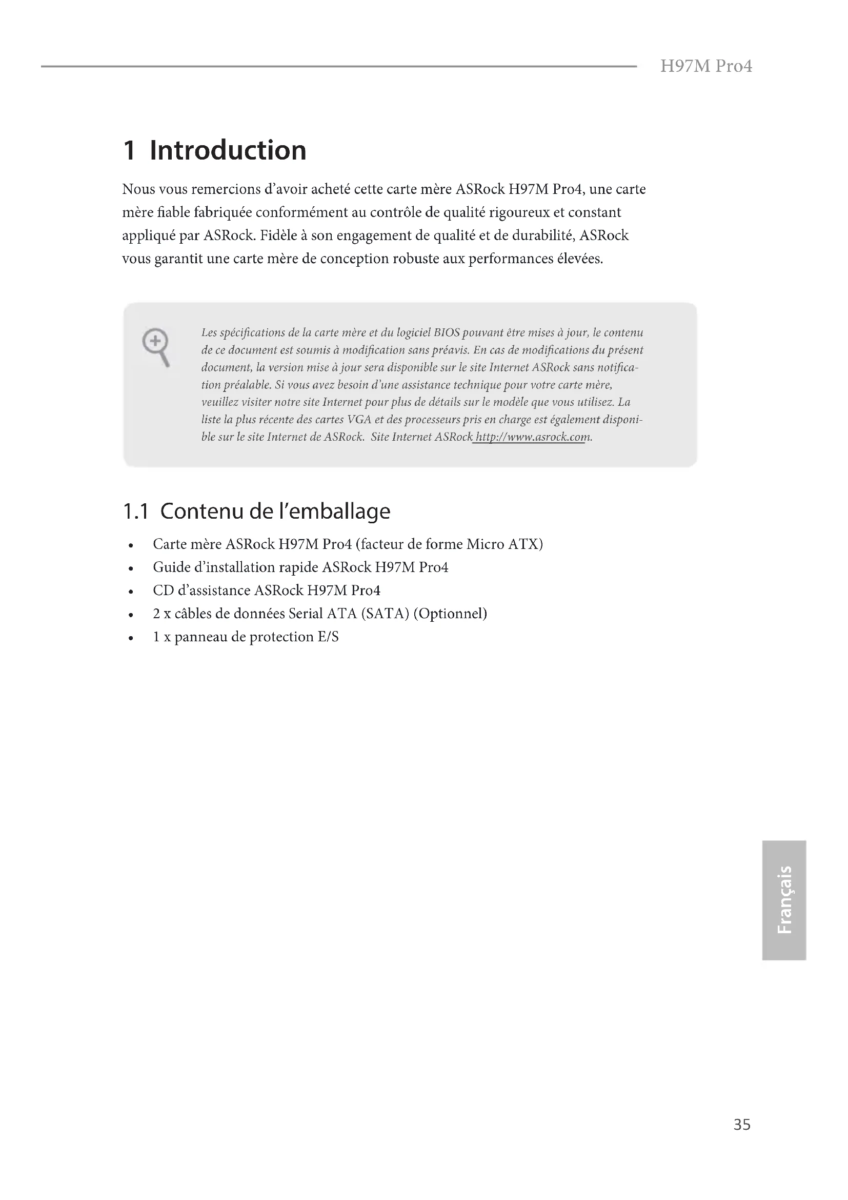 Signal GND35 Français H97M Pro4 1 Introduction Nous vous remercions d’avoir acheté cette carte mère ASRock H97M Pro4, une carte mère able fabriquée conformément au contrôle de qualité rigoureux et constant appliqué par ASRock. Fidèle à son engagement de qualité et de durabilité, ASRock vous garantit une carte mère de conception robuste aux performances élevées.