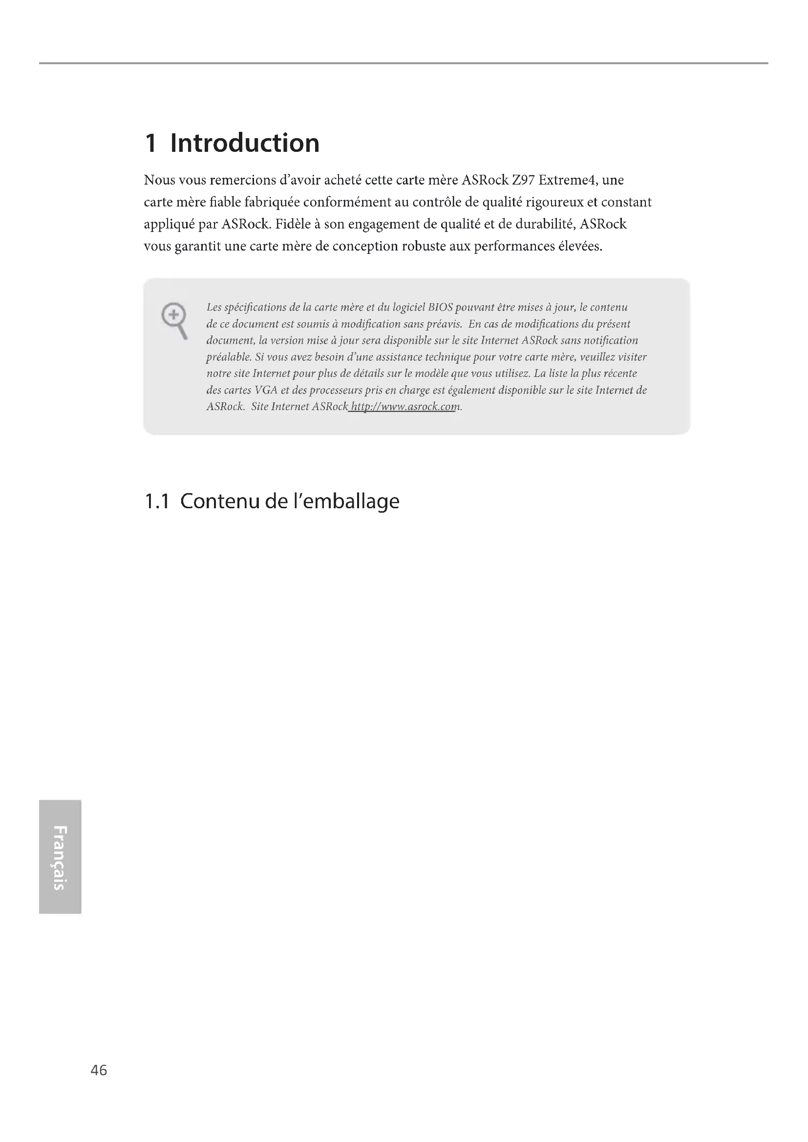 - 1 x vis pour M.2_SSD (NGFF) Prise 3 Les spécications de la carte mère et du logiciel BIOS pouvant être mises à jour, le contenu de ce document est soumis à modication sans préavis. En cas de modications du présent document, la version mise à jour sera disponible sur le site Internet ASRock sans notication préalable. Si vous avez besoin d’une assistance technique pour votre carte mère, veuillez visiter notre site Internet pour plus de détails sur le modèle que vous utilisez. La liste la plus récente des cartes VGA et des processeurs pris en charge est également disponible sur le site Internet de ASRock. Site Internet ASRock http://www.asrock.com.47 Français Z97 Extreme4